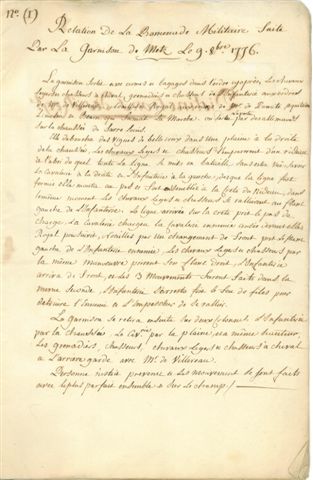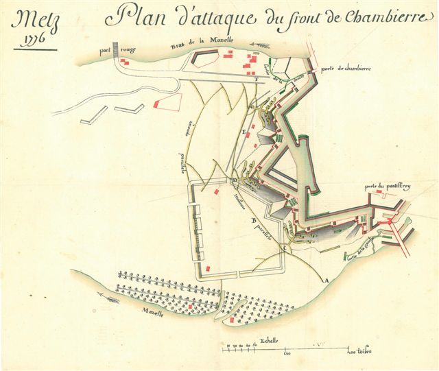 Relations et planches des cinq promenades militaires dans le courant du mois d'octobre 1776, cahier manuscrit de 15 pages in-fol. dont 6 plans d'attaque dessinés à la plume. Joint Plan d'attaque du front de Chambierre, Metz 1776, plume et aquarelle, 28 x 24,5 cm.