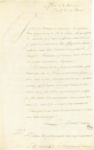 Givet 30 avril .J'ai l'honneur de prévenir Monsieur le Maréchal de Rochambeau que la moitié du corps destiné pour Bouvines y sera aujourd'hui. (