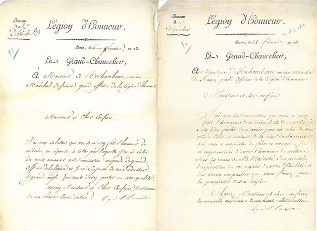 ) Après avoir concouru au décret qui créa une place de maréchal de France, pour le général Rochambeau, j'éprouve une satisfaction très vive à lui annoncer son admission dans la légion d'honneur.
