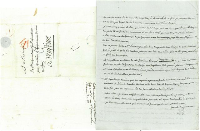 ) Berthier dans la conversation que j'eus avec lui est bien porté pour mon fils et méprisait toutes les intrigues contre lui (...) Il a fait ce qu'il a pu auprès de l'empereur pour l'échange de mon fils. Mais les Anglais n'ont pas voulu entendre de cette oreille là, et ne font nul cas des prisonniers de leurs alliés. Il parait que cette affaire d'échange, soit en masse, soit par individus est à présent entre les mains de M. de Talleyrand. Je l'ai toujours vu bien disposé pour nous