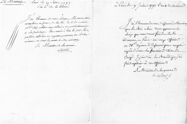 Pierre Auguste LAJARD (1757-1837) ministre de la guerre (juin-juillet 1792). 2 L.S., Paris 8 et 9 juillet 1792 ; 9 pages in-fol. Instructions pour le retour en France du régiment de la Martinique ; nominations approuvées de Daucourt et Panisse, aides-de camp du général Rochambeau.