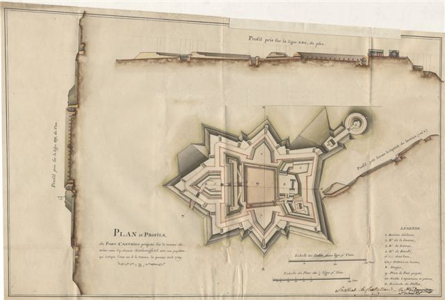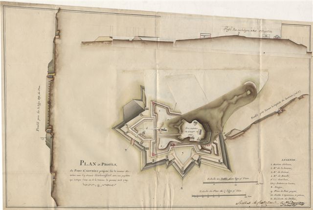 Plan manuscrit et finement aquarellé à l'époque, avec papillotes, figurant différents profils du fort et l'emplacement précis des bastions et redoutes.