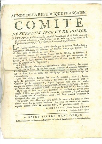 11 affiches (proclamations et extraits de délibérations) imprimées pour la plupart par J.B. Thounens imprimeur à St Pierre et autres impressions locales, dont 5 portant la signature autographe de ROCHAMBEAU.