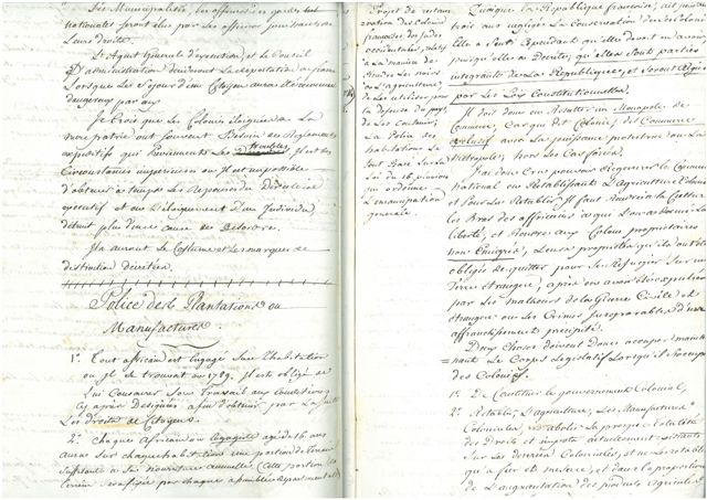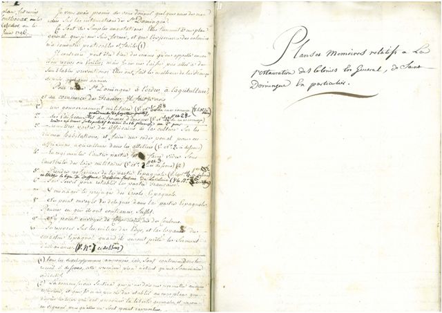 N°1 plan de restauration de St Domingue remis à Sonthonax le 11 messidor ou le 26 juin 1796. Je vous avais promis de vous donner quelques-unes de mes idées sur la restauration de Saint-Domingue. Ce sont de simples annotations. Elles tiennent à un plan général que je me suis formé, et que l'expérience des colonies m'a démontré praticable et facile. Il contrarie peut-être bien des erreurs qu'on appelle idées reçues ou vérités ; mais je ne me laisse pas aller à de semblables préventions : elles ont fait le malheur de la France depuis quelques années (