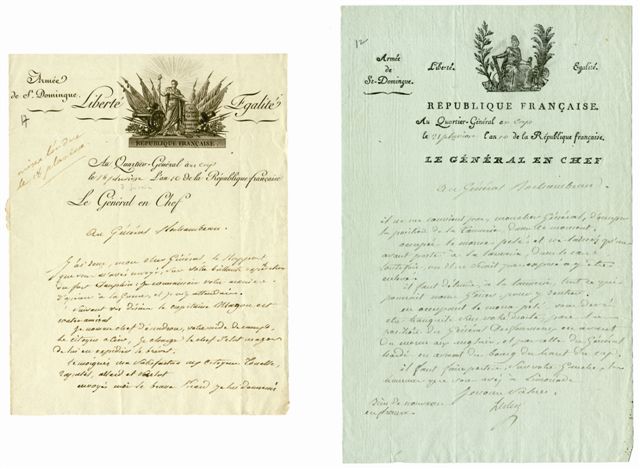 Au Q.G. du Cap 25 prairial (14 juin) (…) Menez tous les colons avec rigueur, il ne faut pas que ces misérables nous entravent, que ceux qui ne nous ont point été utiles sachent qu'ils n'ont point le droit de nous être nuisibles. Vous connaissez l'arrestation de Toussaint, Dessalines était ici lorsqu'on nous a rendu compte, je suis assez content de lui, il vous servira bien pour le désarmement. (…) Tâchez de vous saisir de la personne de La Fortune et de celle de l'Amour d'Arance, qu'ils se rendent au Port au Prince sous quelque prétexte, faites les embarquer furtivement sur un bâtiment et envoyez les moi au Cap, avec ordre au capitaine de ne les débarquer que par mon ordre, il est bon que ces hommes disparaissent de la colonie …