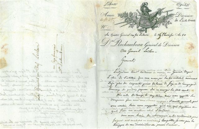 Donatien ROCHAMBEAU. 5 L.A.S. ou L.S., 4 février-28 octobre 1802 ; 6 pages in-4 et 4 pages in-fol., 2 adresses, en-têtes et une vignette (petite déchirure à une lettre).