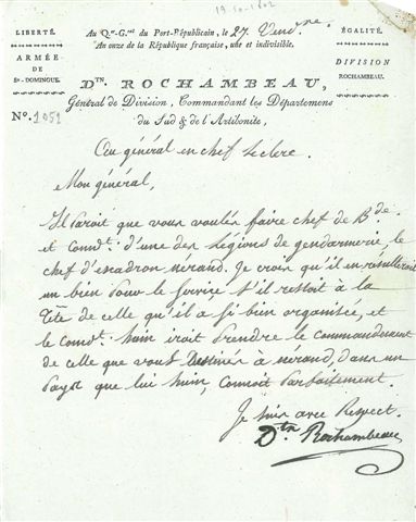 ) Letellier, secrétaire de Dumortier, voué aux noirs et assassin. Caclet, mulâtre, secrétaire de l'Amour de Rance, c'est tout dire. Desfables Greffin, ancien secrétaire de l'Amour de Rance, monstre couvert de crimes. Chanlatte, père et fils, à Jacmel. Il est très urgent de s'en assurer, pour la tranquillité de ce quartier. Le général Martial Besse que vous avez rappelé au Cap, mon général, est selon mon opinion un de ces hommes plutôt nuisibles qu'utiles à la colonie