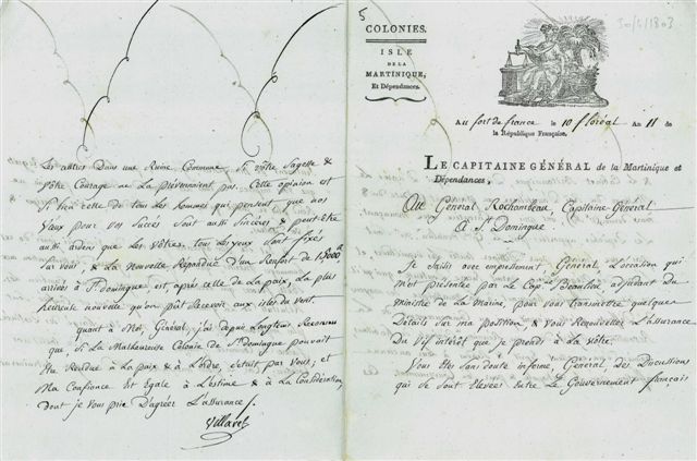 L.S., au général Rochambeau, Fort de France 30 avril 1803 ; 4 pages in-4, en-tête et vignette.