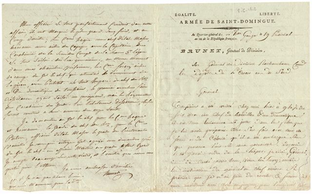 Q.G. de l'habitation Georges 19 prairial (8 juin) (…) Toussaint a été arrêté chez moi hier à 9 h ½ du soir avec un chef de bataillon et un domestique. Il est venu lui-même se jeter dans les filets que je lui avais préparés. Tout s'est fait avec tant de secret et de célérité qu'il a été embarqué sans que personne ne l'ait su aux Gonaïves. Depuis le 14 j'avais ordre de le happer. Je n'ai général rien de caché pour vous vous le savez ; mais les instructions du général en chef étaient si précises que je n'ai pas du révéler ce secret à mon meilleur ami. (…) le traître n'est plus en possibilité de nous nuire. A 10 heures, deux officiers sont partis pour d'Ennery à l'effet de concerter avec Pesquidous les moyens d'arrêter sa femme, son fils, les principaux affidés et mettre le scellé sur les papiers. Il était tenu de porter ce coup à l'ex-gouverneur, car lui-même était au moment de faire une nouvelle levée de boucliers. Depuis longtemps il me croyait sa dupe, et il venait hier pour se blanchir du soupçon que pouvait faire rejaillir sur lui l'assassinat de trois personnes commis avant-hier sur la route de d'Ennery aux Gonaïves par une cinquantaine de brigands de brigands armés. Il a épuisé sa rhétorique pour me prouver sa bonne foi. Il avait pour m'en fournir une preuve sans réplique, ordonné à Néron de marcher avec 200 hommes sur l'Eveillé et de l'avoir mort ou vif. (…) On a arrêté cette nuit dans les environs des Gonaïves Morisset ex-commandant de Toussaint et cinq autres de ses plus fidèles serviteurs. Mes officiers se sont parfaitement conduit dans cette affaire, ils ont marqué le plus grand sang-froid, et au coup d'œil, (…) se sont saisis de l'ex-gouverneur, au même moment dans une chambre voisine (…) se sont emparés du chef de bataillon et du domestique de Toussaint, le premier voulut faire résistance ayant saisi un poignard, mais la baïonnette du carabinier de garde l'a totalement désarmé…
