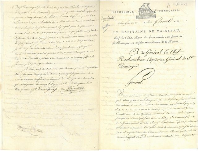 REYNAUD, capitaine de vaisseau, chef de l'état-major des forces navales en station à Saint-Domingue, en mission extraordinaire à la Havane. 3 L.S., à la Havane 11 mai-3 juin 1803 ; 22 pages in-fol., en-têtes et vignettes.