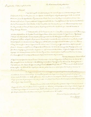 La Havane 4 ventôse (23 février). (...) vous ferez dans les possessions espagnoles et notamment à la Havane ce qu'il vous plaira soit pour des fonds à y obtenir, soit pour les secours de tout genre que vous souhaiterez utiles. Il ne s'agit que de vouloir avec l'énergie de votre caractère et soutenir le ton que vous avez pris, qui convient à votre situation. S'il vous faut plus de chiens que ceux que j'envoye vous devez compter pour en avoir de bons sur le prix de 50 piastres vendus à St Domingue, 120 pour les chevaux. (