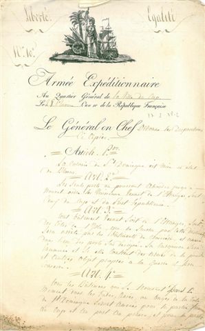 JOINT : 6 exemplaires de la Gazette officielle de Saint-Domingue et un exemplaire des Affiches américaines de Saint-Domingue, 1803, imprimés - Mémoire manuscrit anonyme intitulé Coup d'il sur Saint-Domingue, 8 pages in-fol. - Mémoire manuscrit anonyme intitulé Observations sur l'expédition de Saint-Domingue et le système des lois spéciales annoncées aux colonies par la Constitution française, 9 pages in-fol. - 4 pièces diverses manuscrites en anglais dont une datée du 25 juillet 1807 avec un superbe cachet de cire rouge - 2 pièces autographes du maréchal de ROCHAMBEAU relatives à Saint-Domingue - Copie des dispositions ordonnées par le général Leclerc, au Cap 28 pluviôse X, avec vignette Armée expéditionnaire - Esquisse de la conduite de l'ex-préfet Magnytot de Saint Domingue, 8 pages in-fol. manuscrites - L.A.S. par RAFFIN, directeur de l'octroi, 26 octobre 1801, qui fait un état des lieux des hommes qui composent l'armée rebelle - L.A.S. par Jean-Baptiste de VAUBLANC (1761-1812), Paris 27 mars 1803 - 8 pièces manuscrites diverses (pétition, lettres) relatives à Saint-Domingue, 1802-1810.