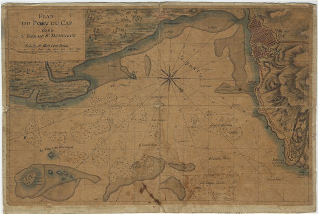 Joint : Plan du Port du Cap dans l'isle de St-Domingue. Plume et aquarelle. Calque contrecollé sur papier. 37,5 x 25 cm.
