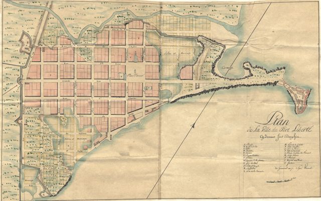 Plan de la ville du Fort Liberté, cy-devant Fort-Dauphin. Plume et aquarelle. Papier calque collé sur papier. 87,5 x 56,5 cm.