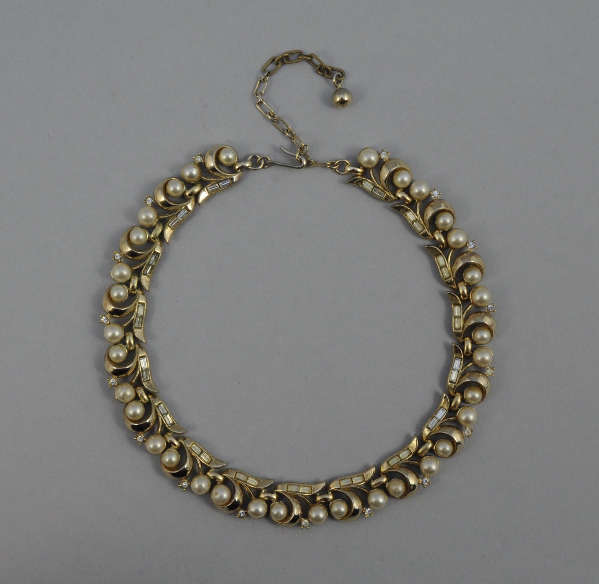 COLLIER articulé à décor d'enroulement en métal doré orné de perles fausses agrémentées de pierres de synthèses blanches (une perle décollée).