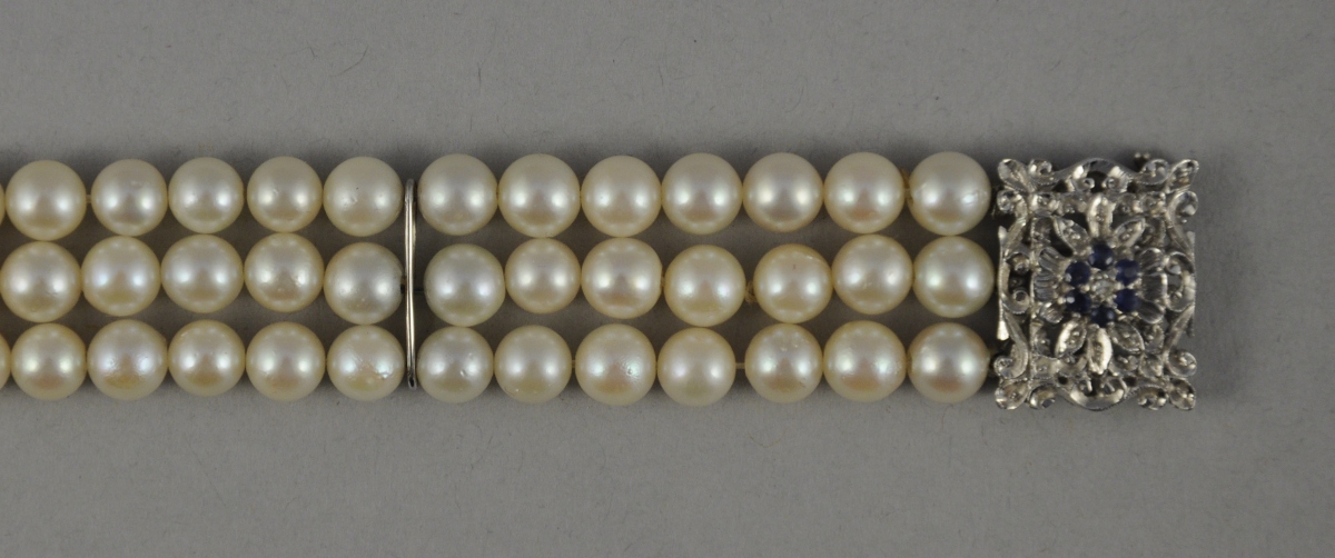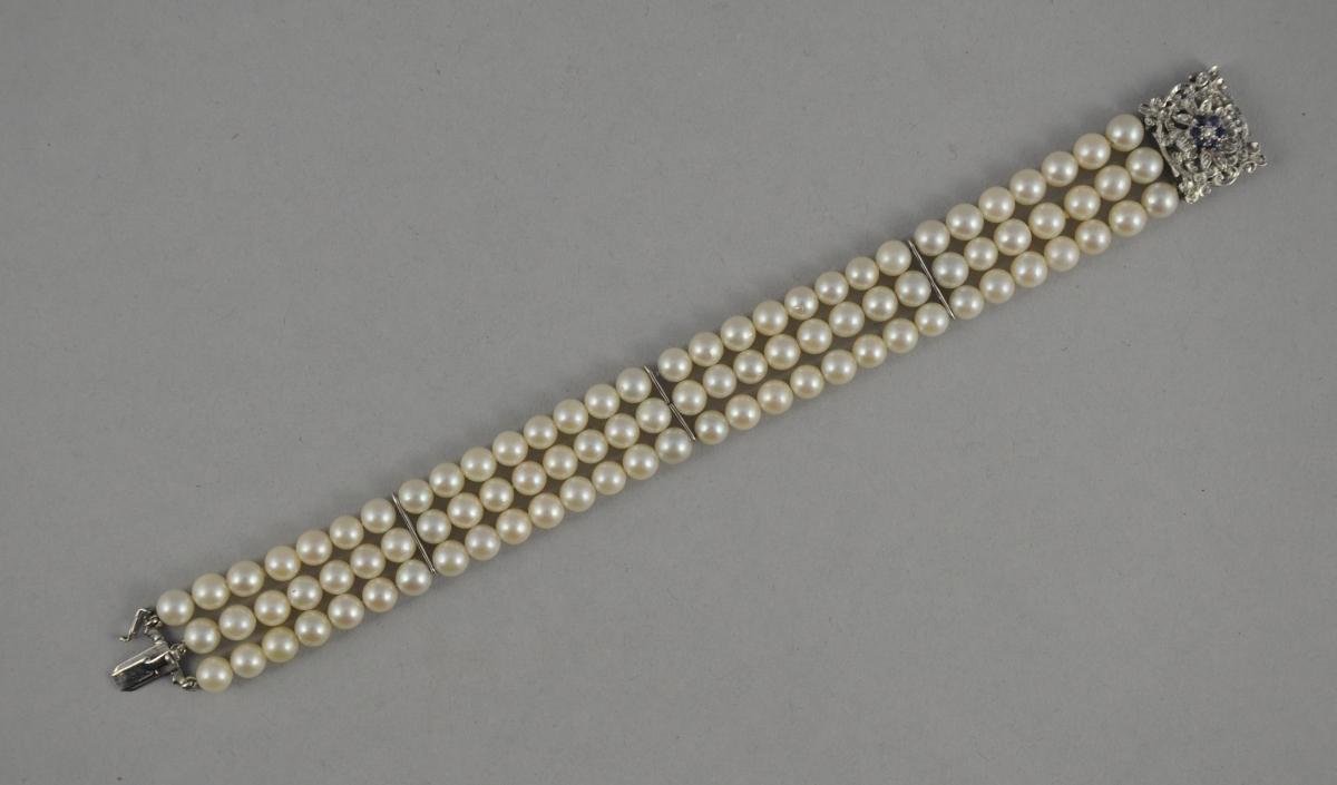 BRACELET composé de trois rangs de perles de culture blanches ornés de trois intercalaires, le fermoir en or gris serti d'un petit diamant dans un entourage de six saphirs.