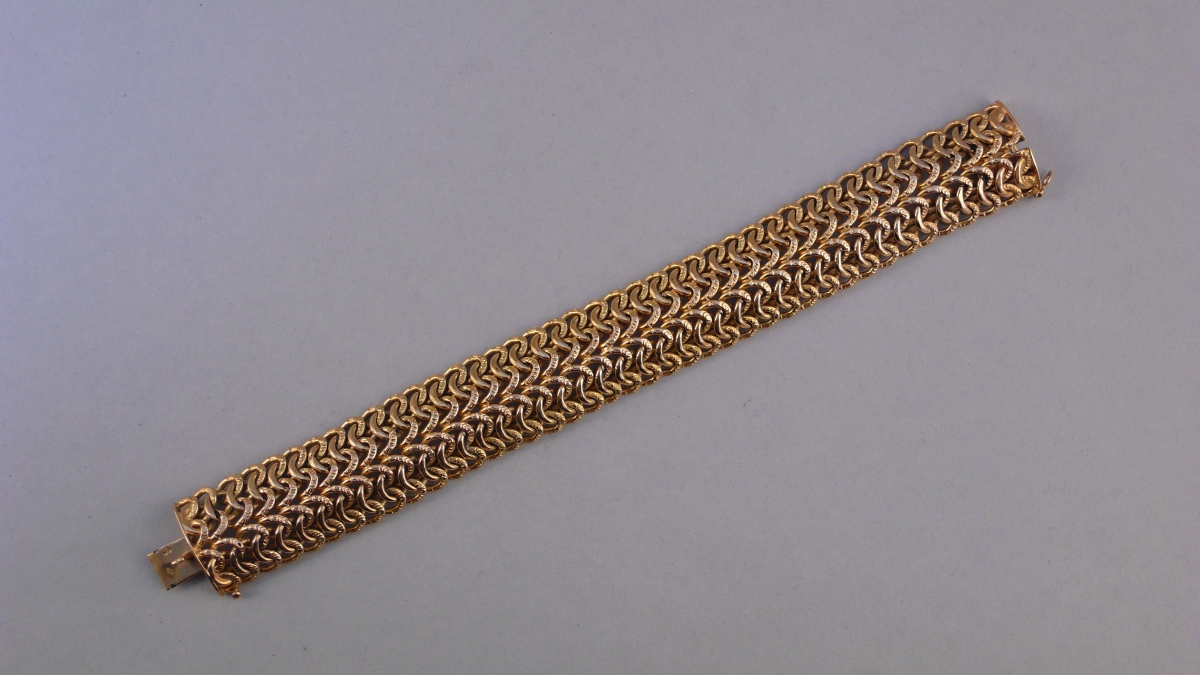 Large BRACELET articulé en or jaune à maillons entrelacés unis et gravés.