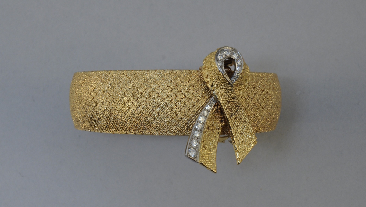 BRACELET ruban en or jaune tressé et amati, orné d'un motif noeud partiellement serti de diamants ronds de taille brillant et taillés en huit-huit. (Transformation du motif à partir d'un clip de revers).