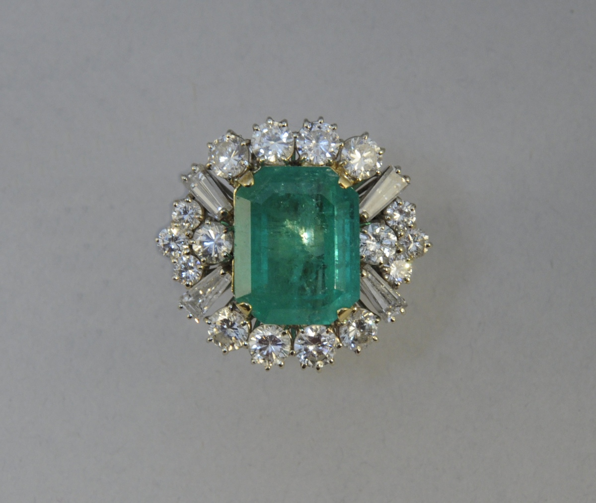 BAGUE en or gris sertie d'une émeraude rectangulaire à pans coupés d'environ 10 / 12 carats, dans un entourage de diamants de taille brillant et de diamants baguettes.