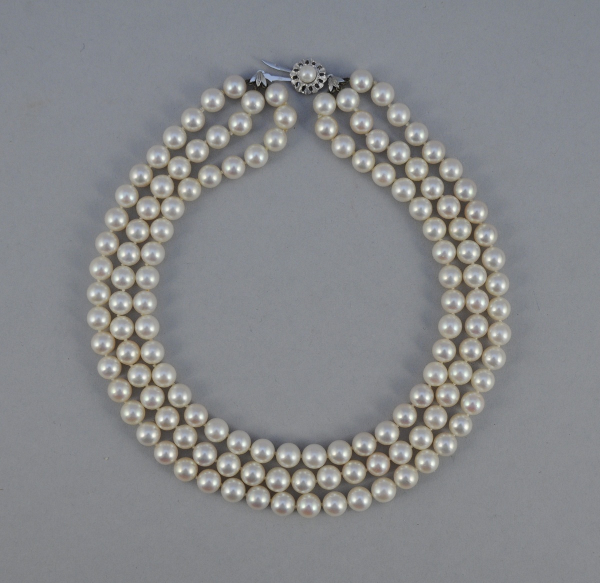 COLLIER trois rangs de quarante et une, quarante-sept et quarante-trois perles de culture choker, le fermoir en or gris.