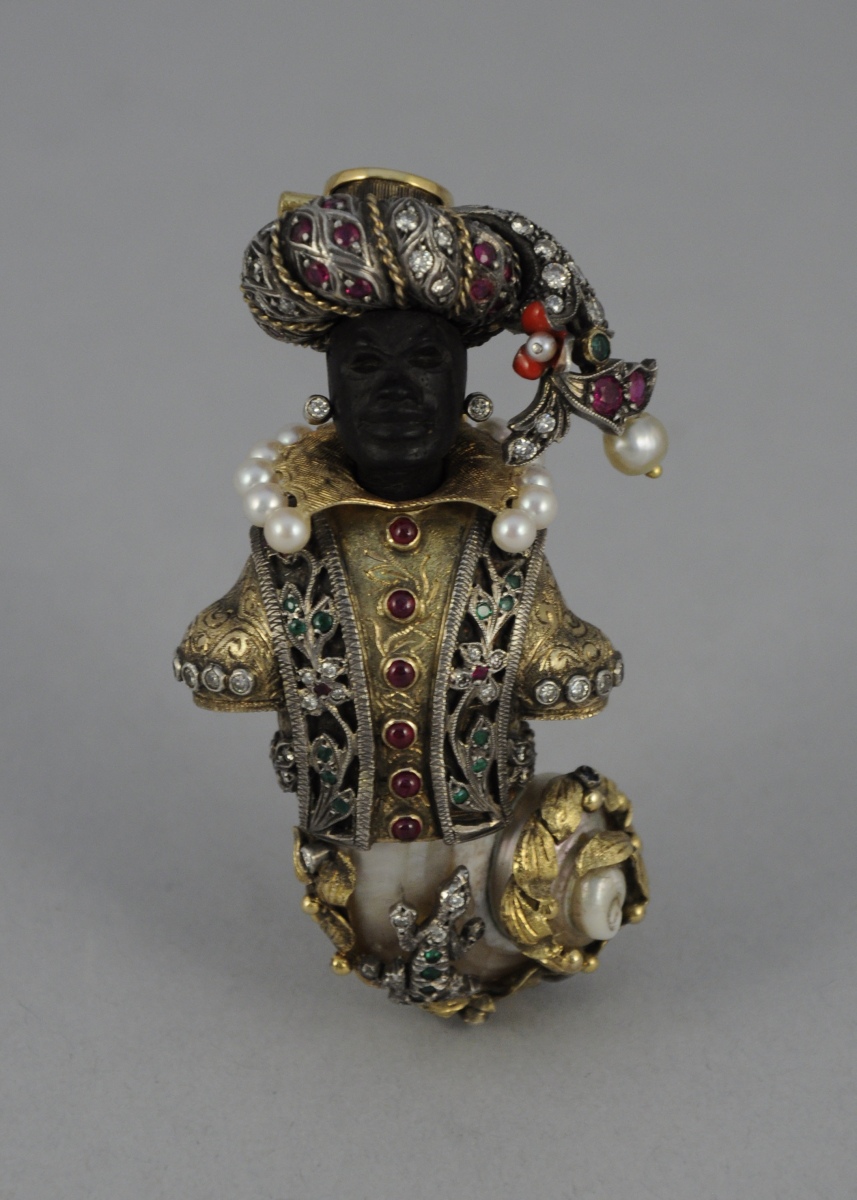 BROCHE et PAIRE DE PENDANTS D'OREILLES à décor de "maure" en or et argent ornés de perles
