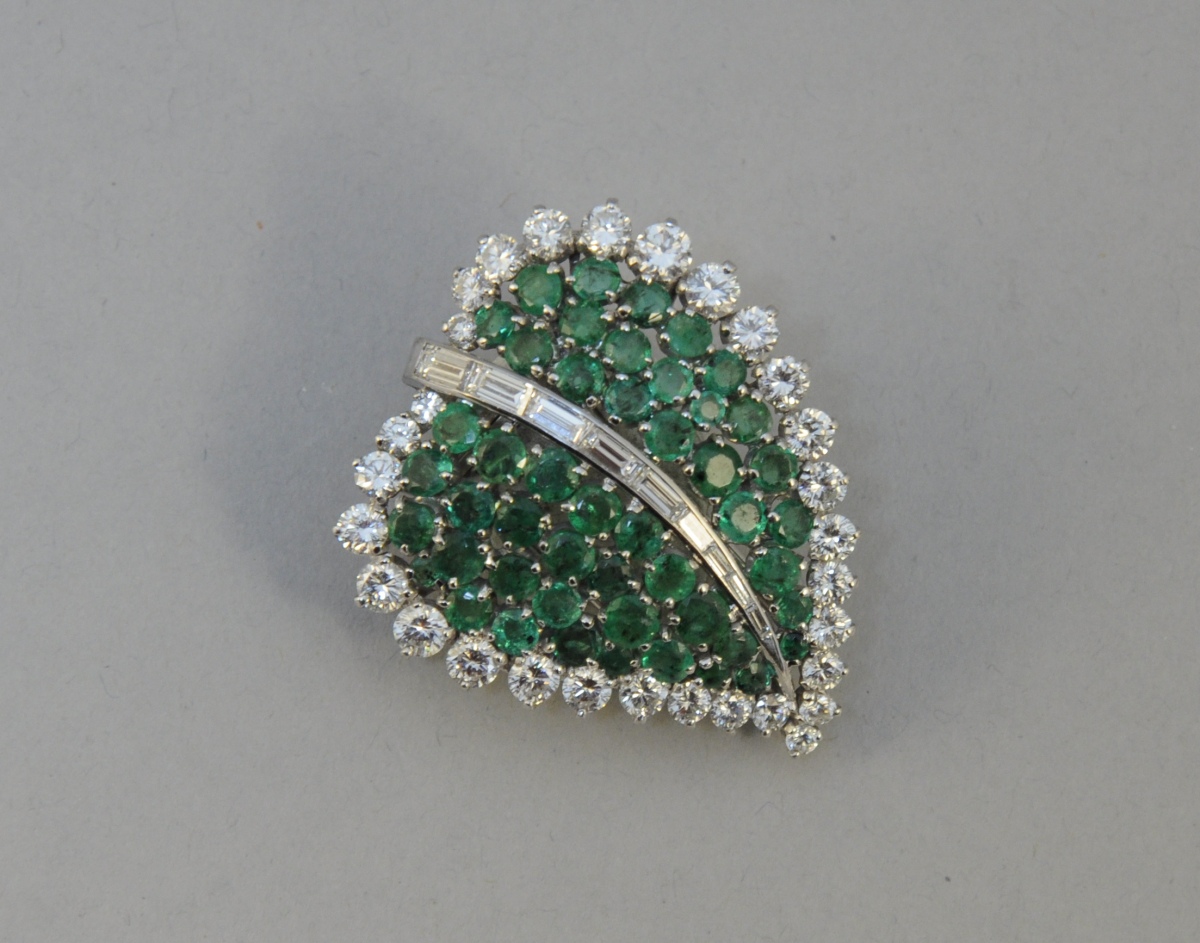 BROCHE feuille en platine et or gris gravée d'émeraudes rondes d'environ 3 / 3,50 carats, le pourtour serti de diamants de taille brillant, la nervure ornée de diamants baguettes.