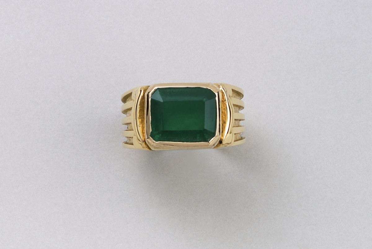 BAGUE CHEVALIÈRE en or jaune ornée d'une émeraude rectangulaire à pans coupés sertie clos, d'un poids supérieur à 6 carats (petit choc à un angle).