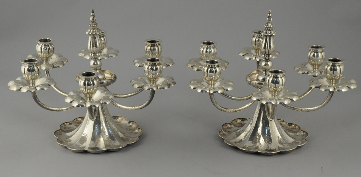 Art Déco, en argent martelé. La base évasée en forme de trompette retient six bras en forme de fleur. Prise centrale rehaussée d'un motif à graine sur bulbe.