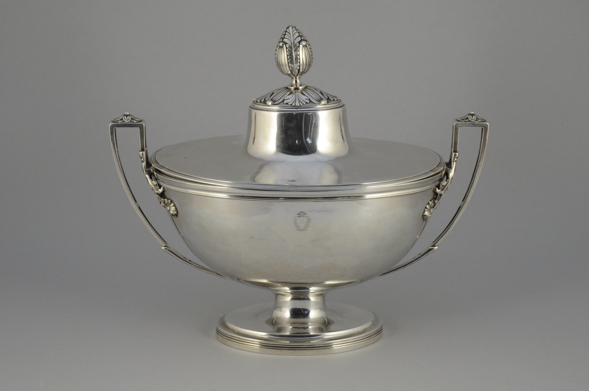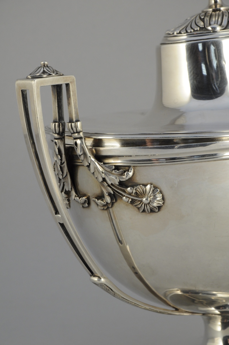 oblongue et sa doublure, sur piédouche en argent uni à décor au filet. Les anses ajourées à décor appliqué d'acanthes et fleurettes. Le couvercle à doucine sommé d'une graine à décor de palmettes et fleurs de pavot.