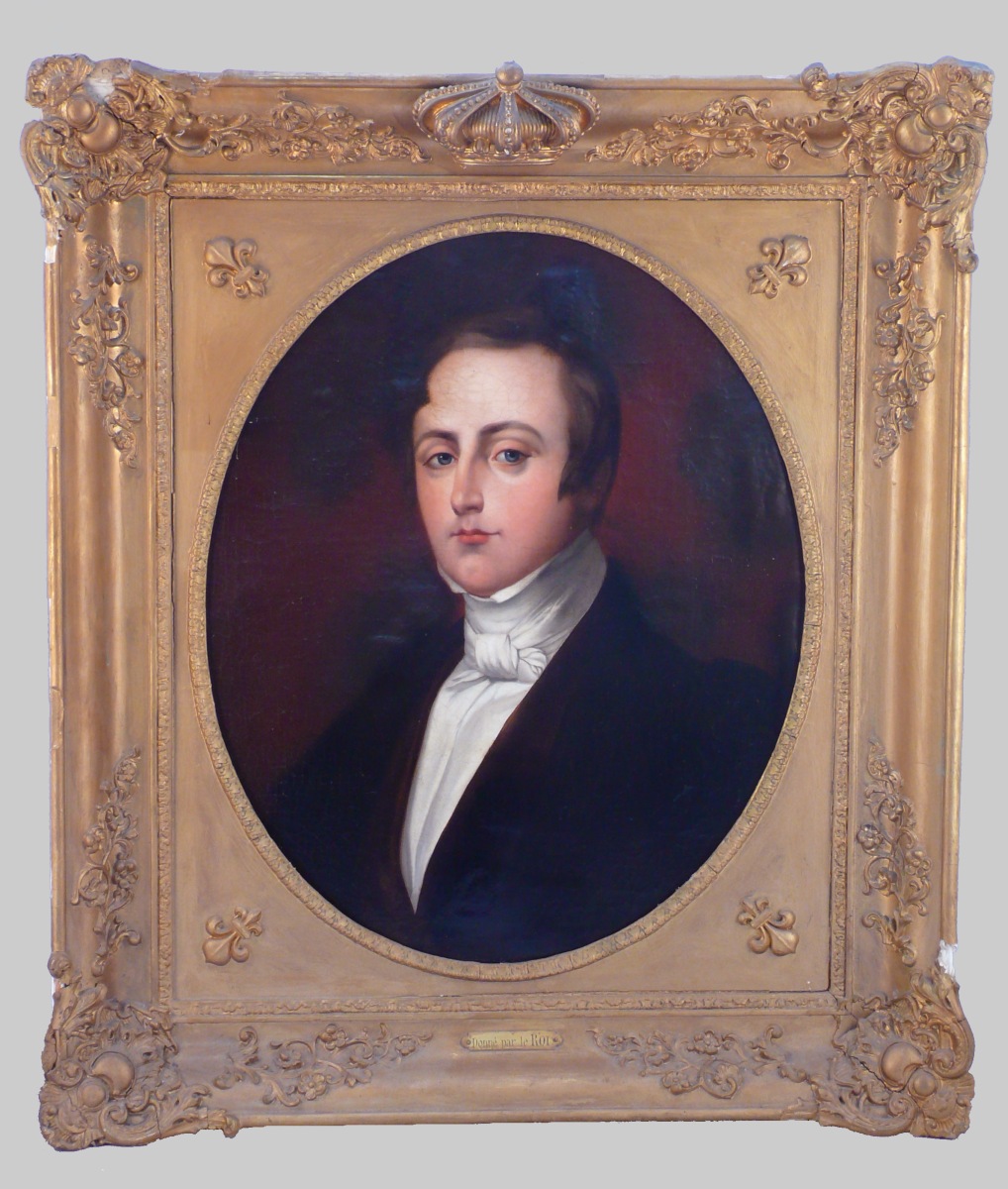 Riche encadrement redoré, aux fleurs de lys en écoinçons et couronne royale fermée dans la partie supérieure. Cartouche " Donné par le ROI ". 83 x 72 cm (accidents et restaurations).