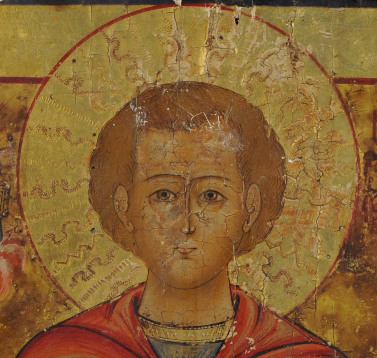 Icône. En haut à gauche le Christ bénissant, dans les marges deux Saints et une Sainte.