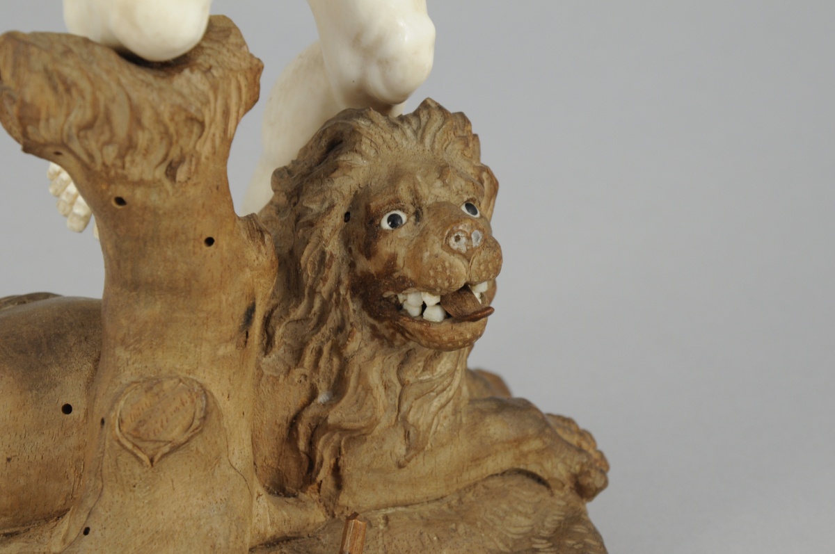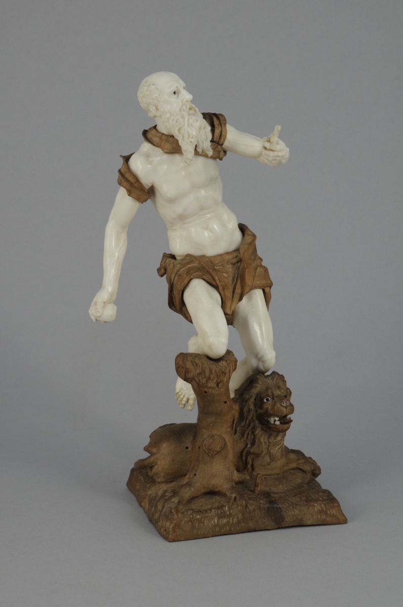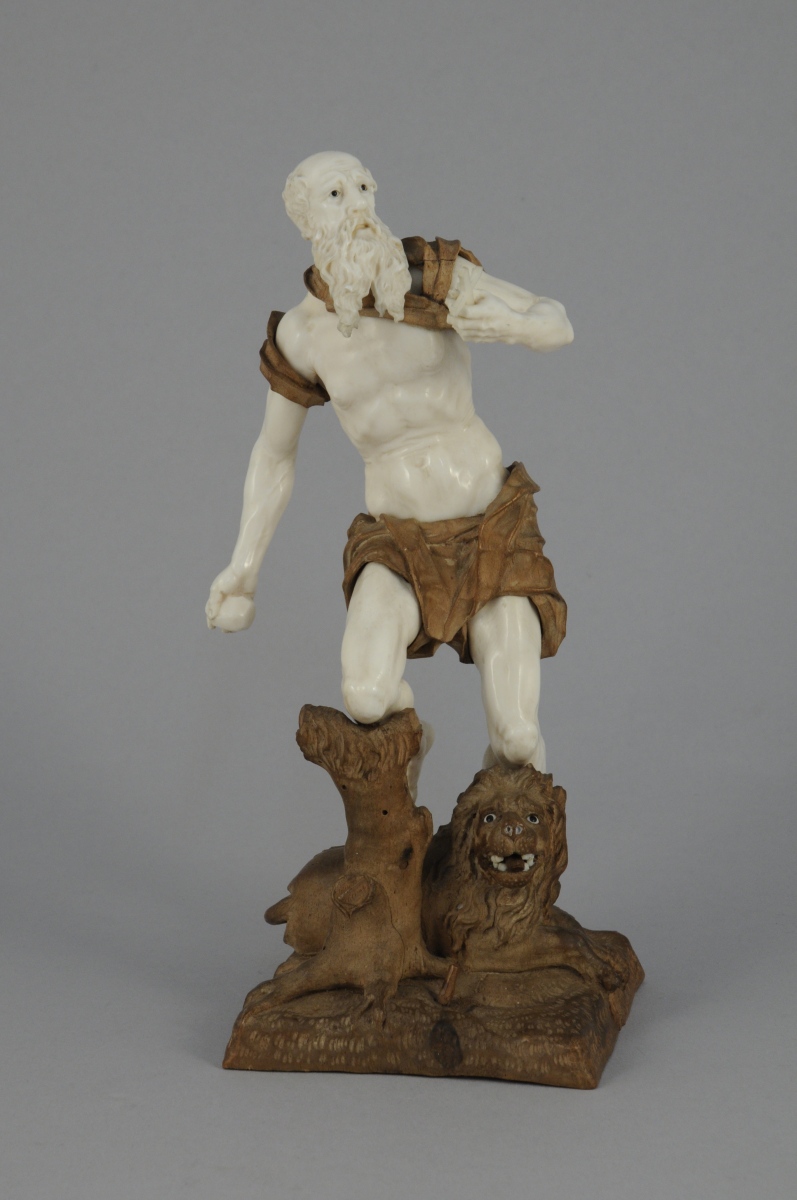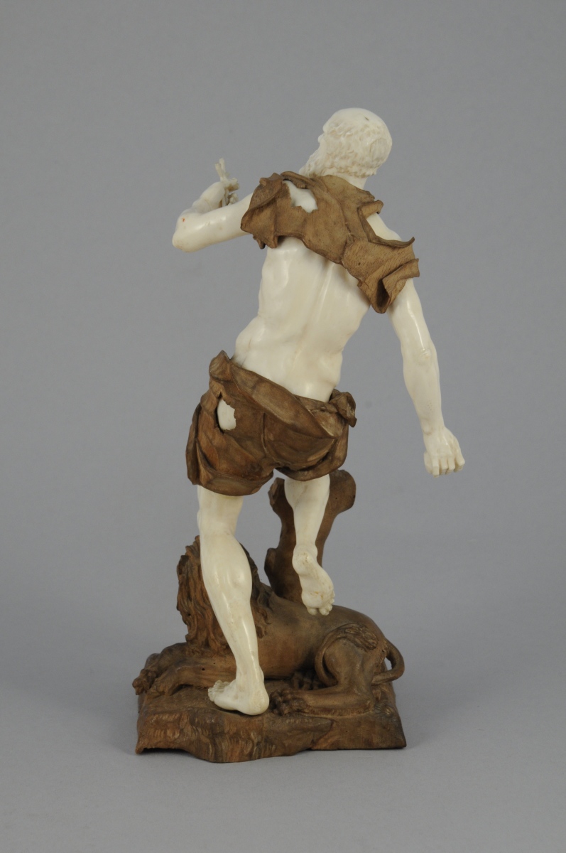 autour de son cou et d'un drapé d'étoffe lui entourant la taille, ceux-ci sont rapportés sur son corps et sculptés dans du bois. Il pose le genou droit, la jambe étant pliée, sur une souche d'arbre et la gauche sur la tête du lion, ceux-ci sont sculptés dans le bois, les yeux du lion et les dents de l'animal en ivoire et ébène.