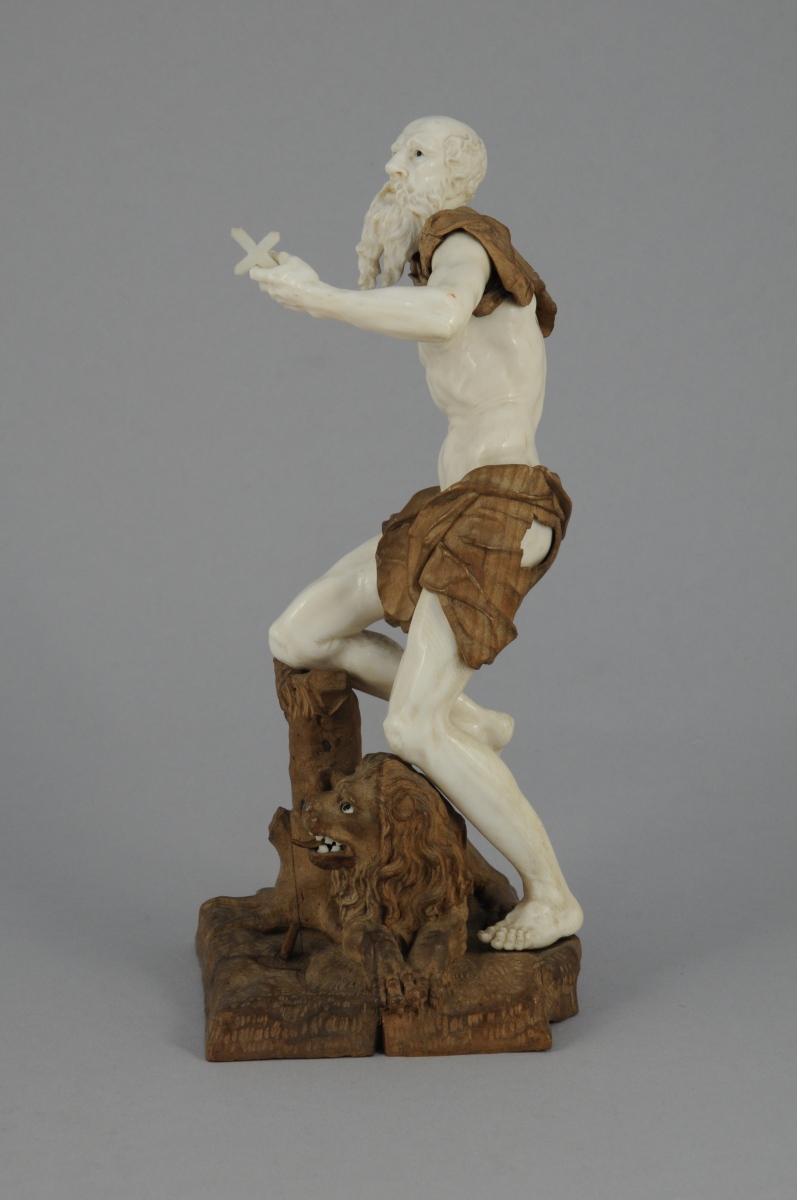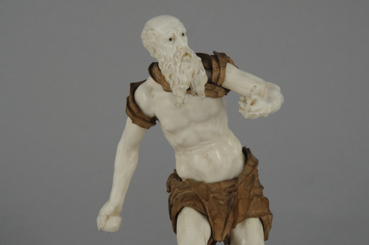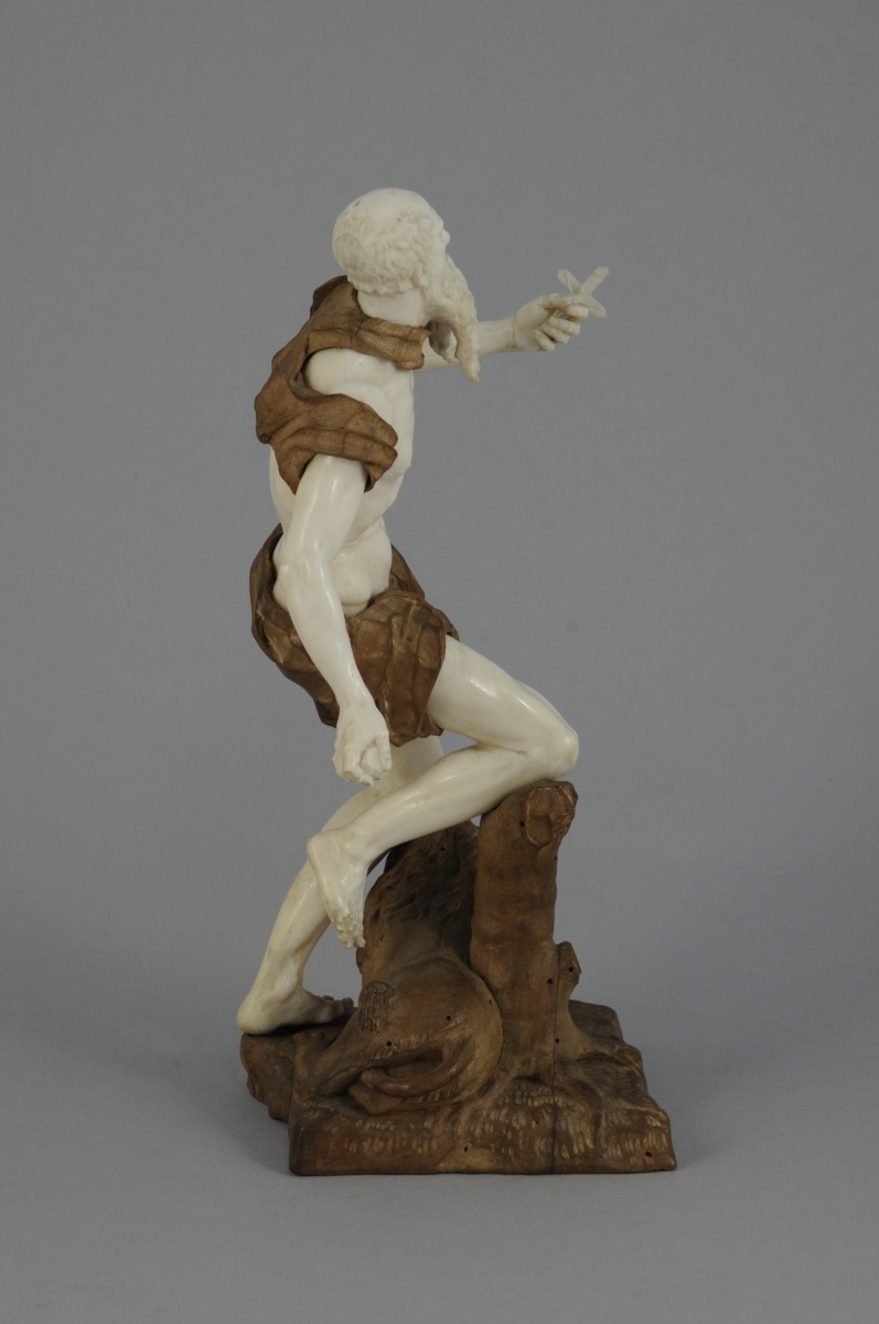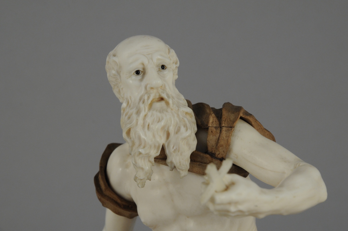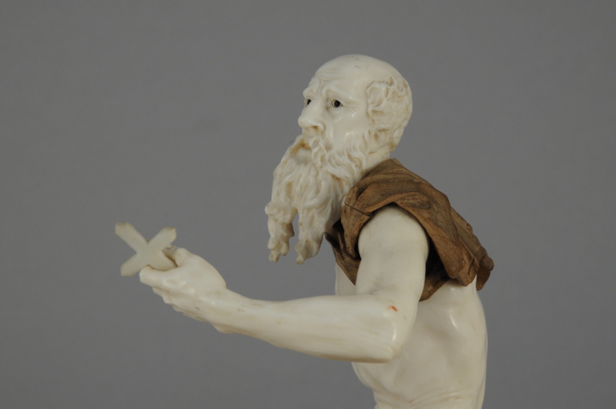 Groupe en ivoire et bois fruitier. Le Saint sculpté dans un bloc d'ivoire tient dans sa main gauche un crucifix, la pupille de ses yeux formée d'une perle d'ébène. Il est vêtu d'une écharpe entourée