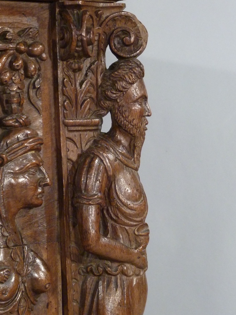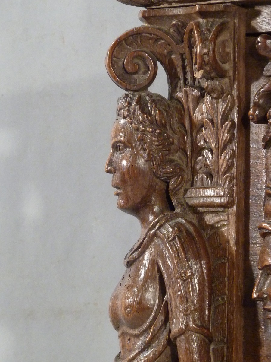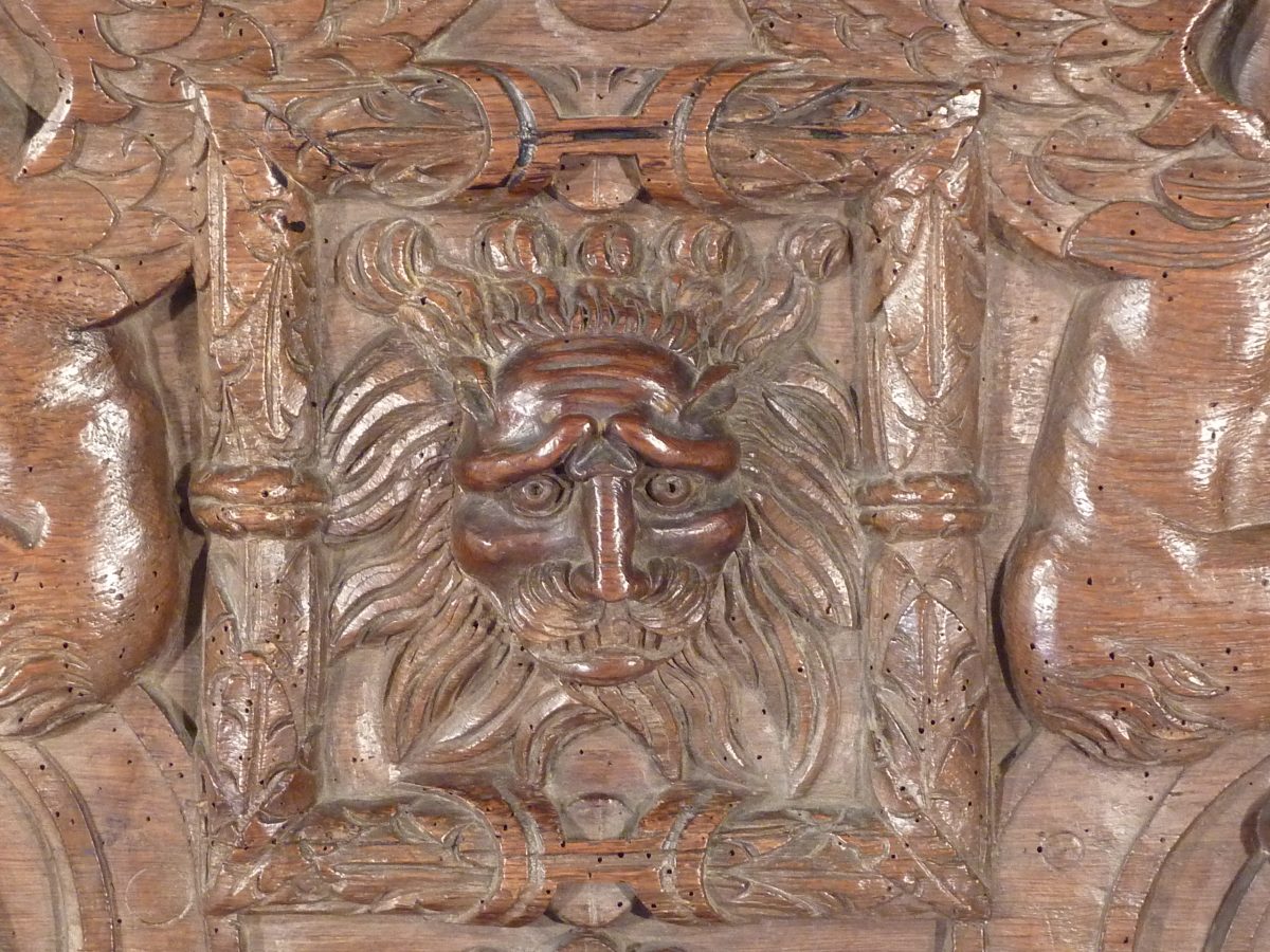 en chêne massif sculpté ouvrant par le plateau et par deux vantaux latéraux. La façade, à très riche décor central d'une allégorie de la Fécondité, représente, sur fond d'un paysage architecturé, une femme entourée de quatre enfants et deux chiots dans un cartouche à enroulements et têtes de divinités. De chaque côté, deux chimères sommées de paniers fournis sont montées par des personnages drapés en cueillant les fruits. Les vantaux centrés d'un mufle de lion dans un encadrement feuillagé et flanqué de chimères ailées à corps de cerf sur des volutes en console. Les montants sculptés en haut-relief, à décor de chapiteaux corinthiens, représentent des saints personnages : un homme barbu tenant un calice et une cruche sur un loup, une femme tenant un panier de fruits sur un chien et, pour les montants postérieurs, deux hommes, dont un barbu, tiennent un poisson par la queue. Les traverses inférieure et supérieure à décor d'entrelacs feuillagés et volutes. Entrée de serrure ornée d'une ferronnerie à motif d'enroulements.