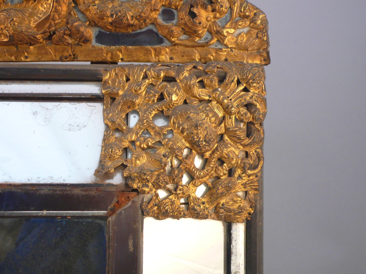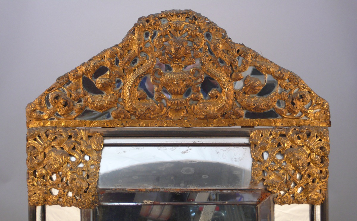 rectangulaire à pans coupés en glace biseautée et laiton doré repoussé. Les écoinçons et le fronton à décor ajouré de vases fleuris flanqués de dauphins affrontés, d'oiseaux sur des branchages en volutes et de guirlandes de fleurs.