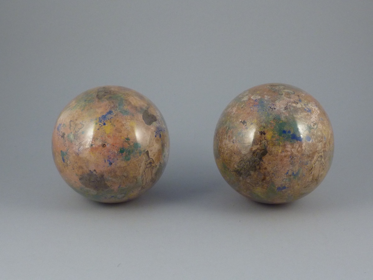 Paire de BOULES à PERRUQUESrondes en verre soufflé. Décor fixé...