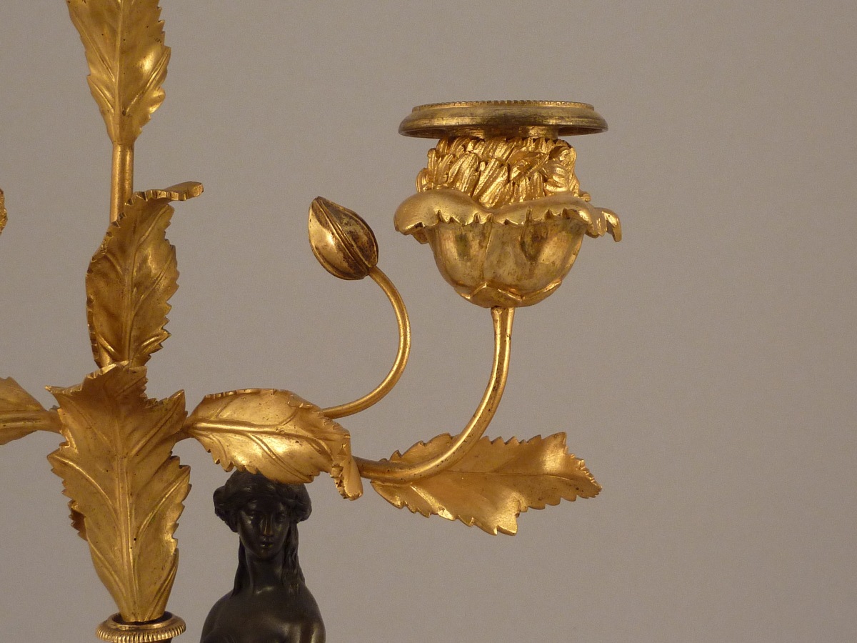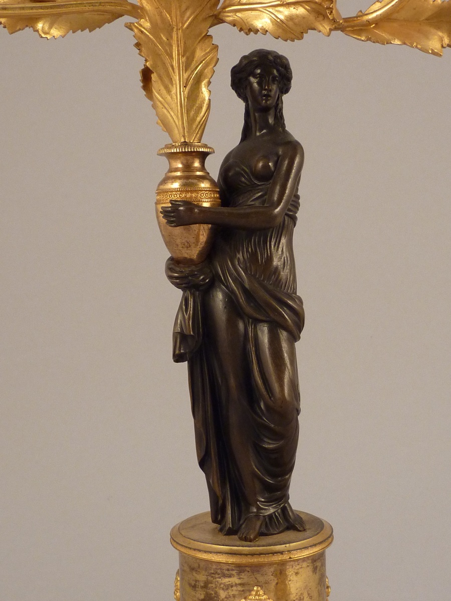 à trois bras de lumières en bronze patiné, doré et finement ciselé. Les fûts composés d'un jeune homme et d'une femme drapés à l'Antique tenant chacun une urne surmontée de feuilles et fleurs de pavot formant les bobèches. Ils reposent sur un socle cylindrique à décor de rangs de perles, masques et palmettes terminé par une base carrée.