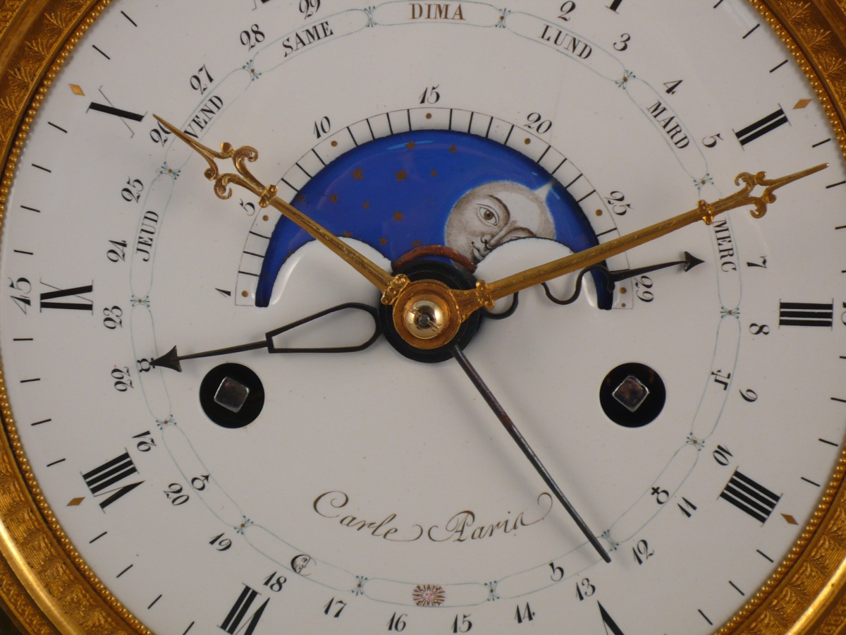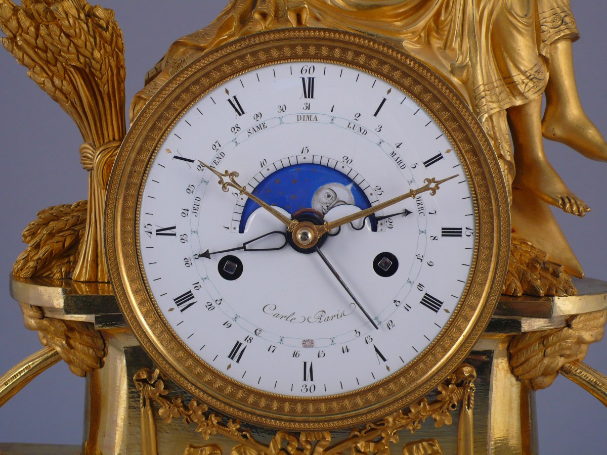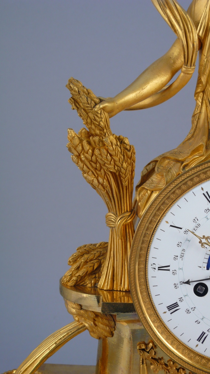 en bronze doré représentant Cérès en déesse de la Fertilité, de l'Agriculture, symbolisant l'Été. Élégamment drapée, la faucille à la main, elle est assise sur une fontaine. La base est décorée de roseaux et d'épis. Un amour conduit un char tiré par un sphynx. Beau mouvement à complications horlogères, à quantièmes, signes du zodiaque et phases de la lune. Cadran signé CARLE Paris.