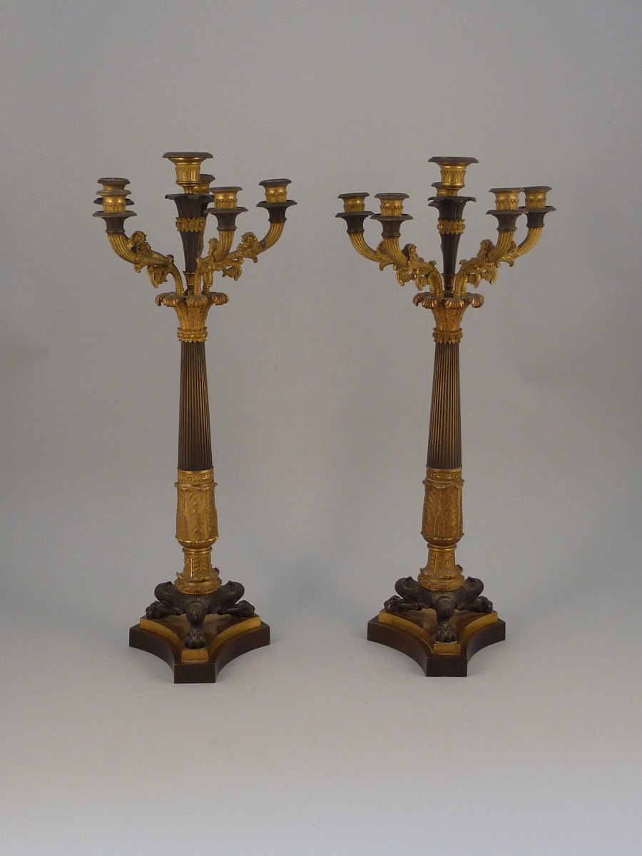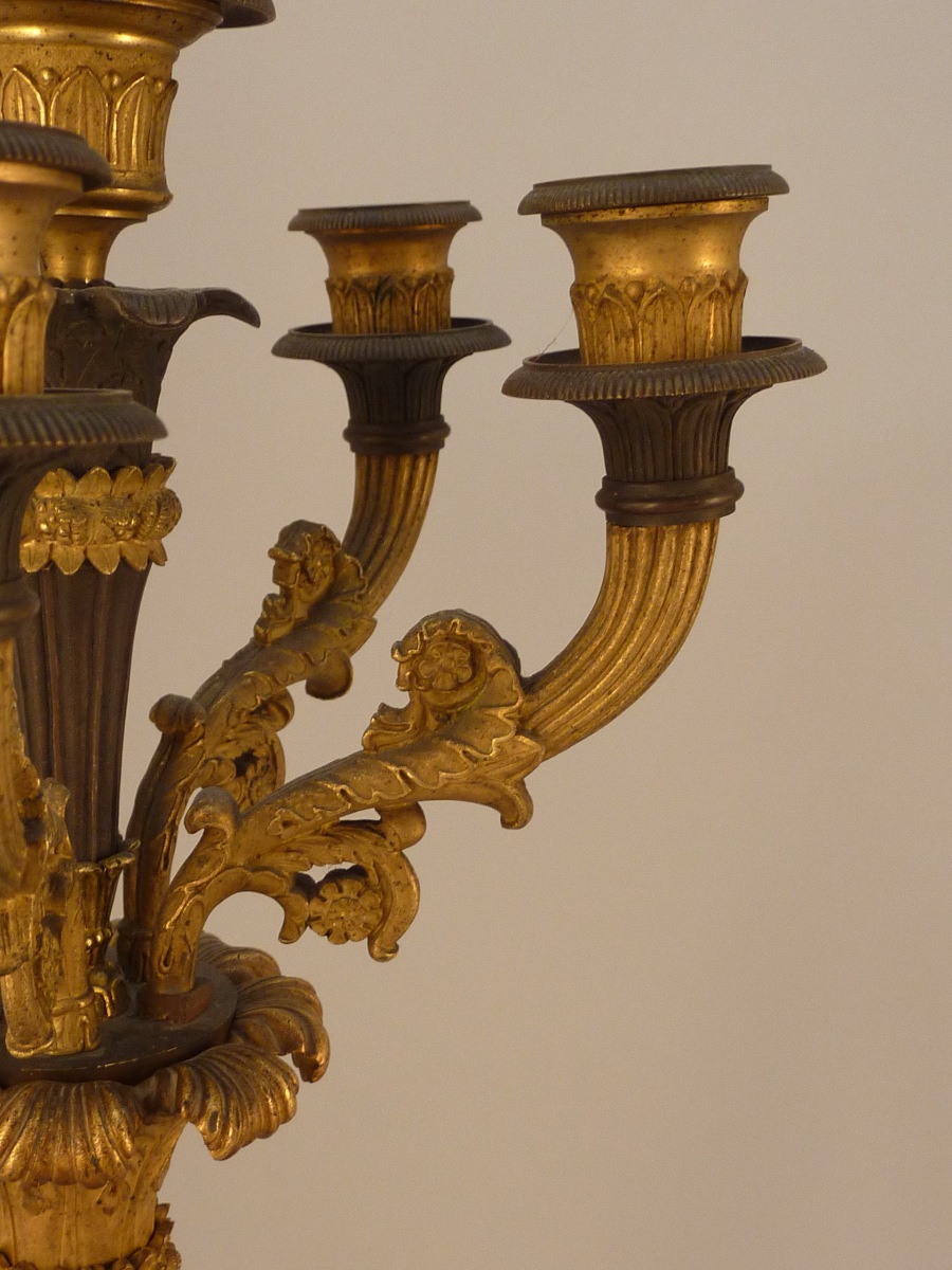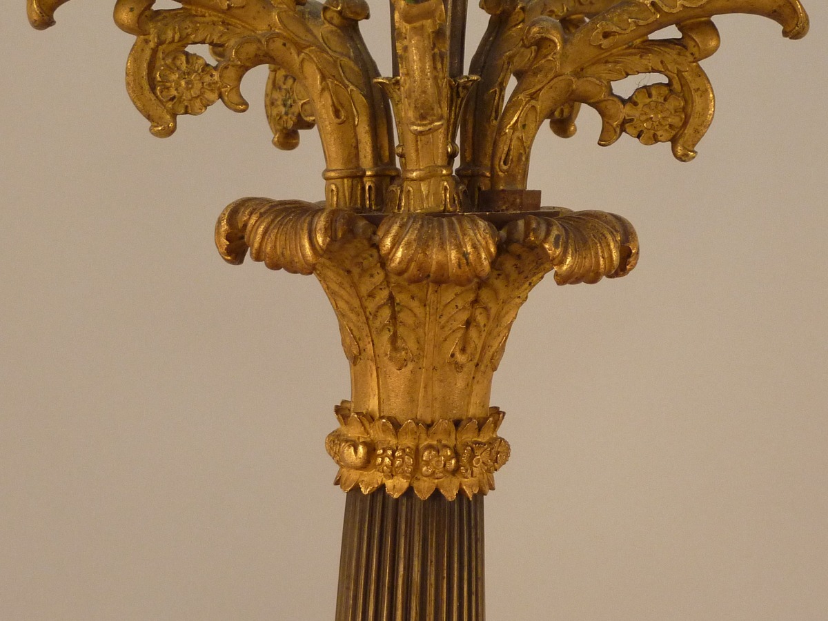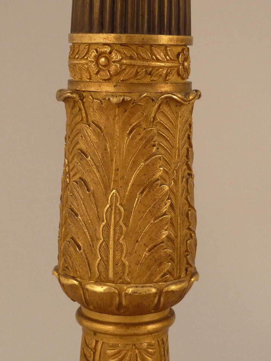 à six bras de lumière en bronze ciselé à patine brune et doré à décor de palmettes, acanthes et frises de fleurs. Les bobèches à décor de feuilles de laurier. Le fût cannelé, terminé par un chapiteau corinthien tenant cinq bras de lumières à décor d'enroulements d'acanthes et quintefeuilles, est sommé d'une bobèche en vase. Il repose sur une base tripode à griffes de lion.