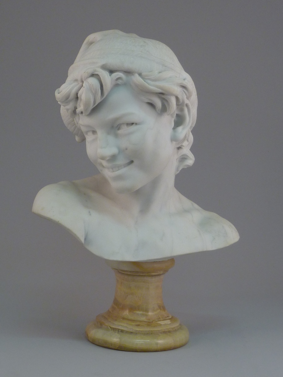 Séjournant en Italie, en tant que Prix de Rome 1854, Carpeaux part chercher l'inspiration à Naples. À l'automne 1857, il sculpte son fameux "Pêcheur à la coquille". Cependant à Paris, loeuvre est quelque peu critiquée par lAcadémie, ce qui amène l'artiste à refuser de vendre son plâtre original à lÉtat. Il en fera fondre deux épreuves en bronze et en tirera deux bustes : Le Rieur aux pampres et Le Rieur napolitain, notre modèle ici en marbre. Ce sujet est, par ailleurs pour lui, loccasion de rendre hommage à son premier maître, RUDE, dont la mort, deux ans plus tôt, la profondément marqué.