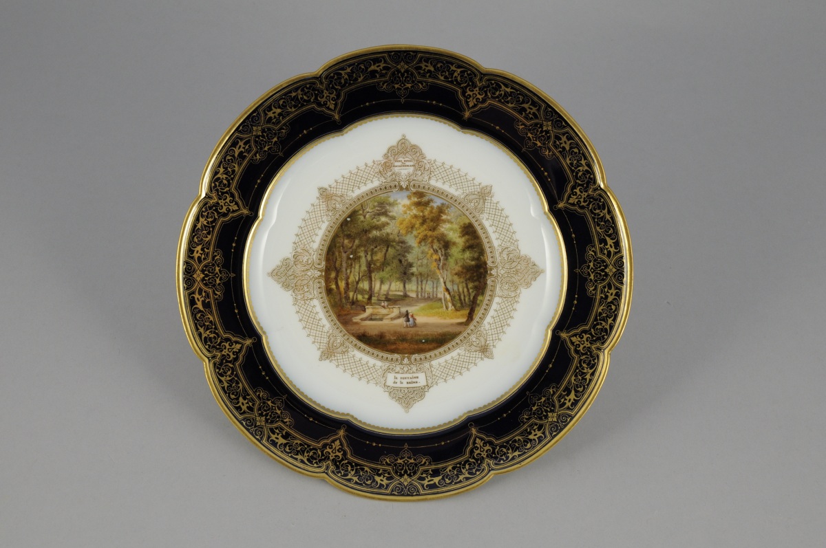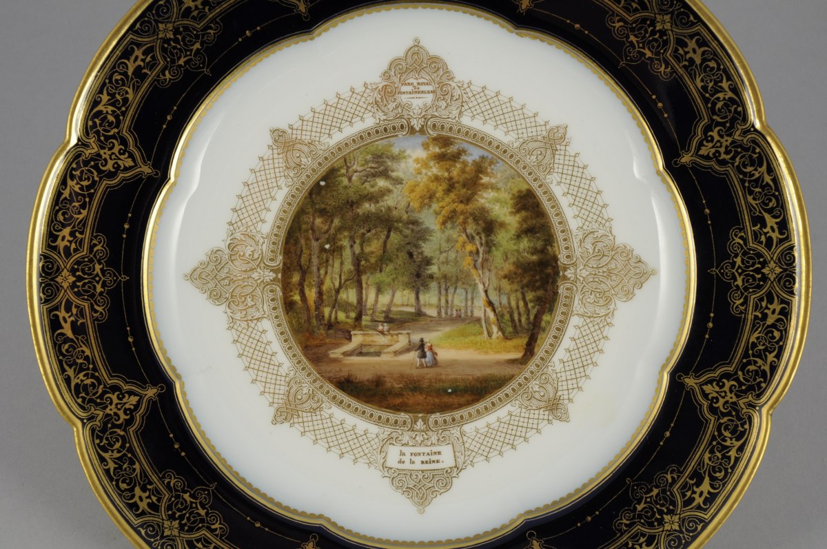 en porcelaine, l'aile polylobée à fond bleu doré de rinceaux de feuilles. Le bassin à décor peint de vues des parcs royaux de Saint-Cloud et Fontainebleau dans des encadrements dorés d'oves et d'entrelacs.