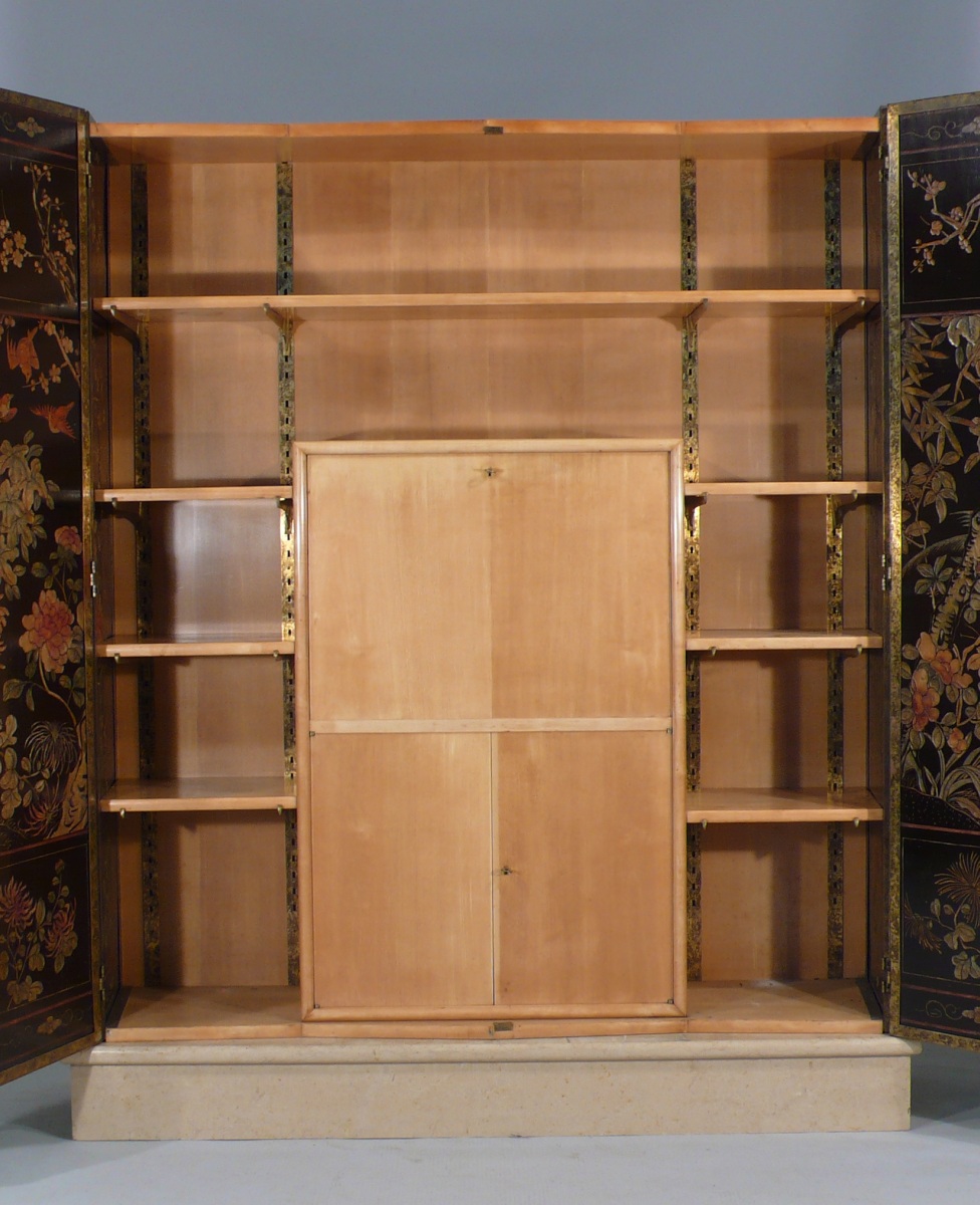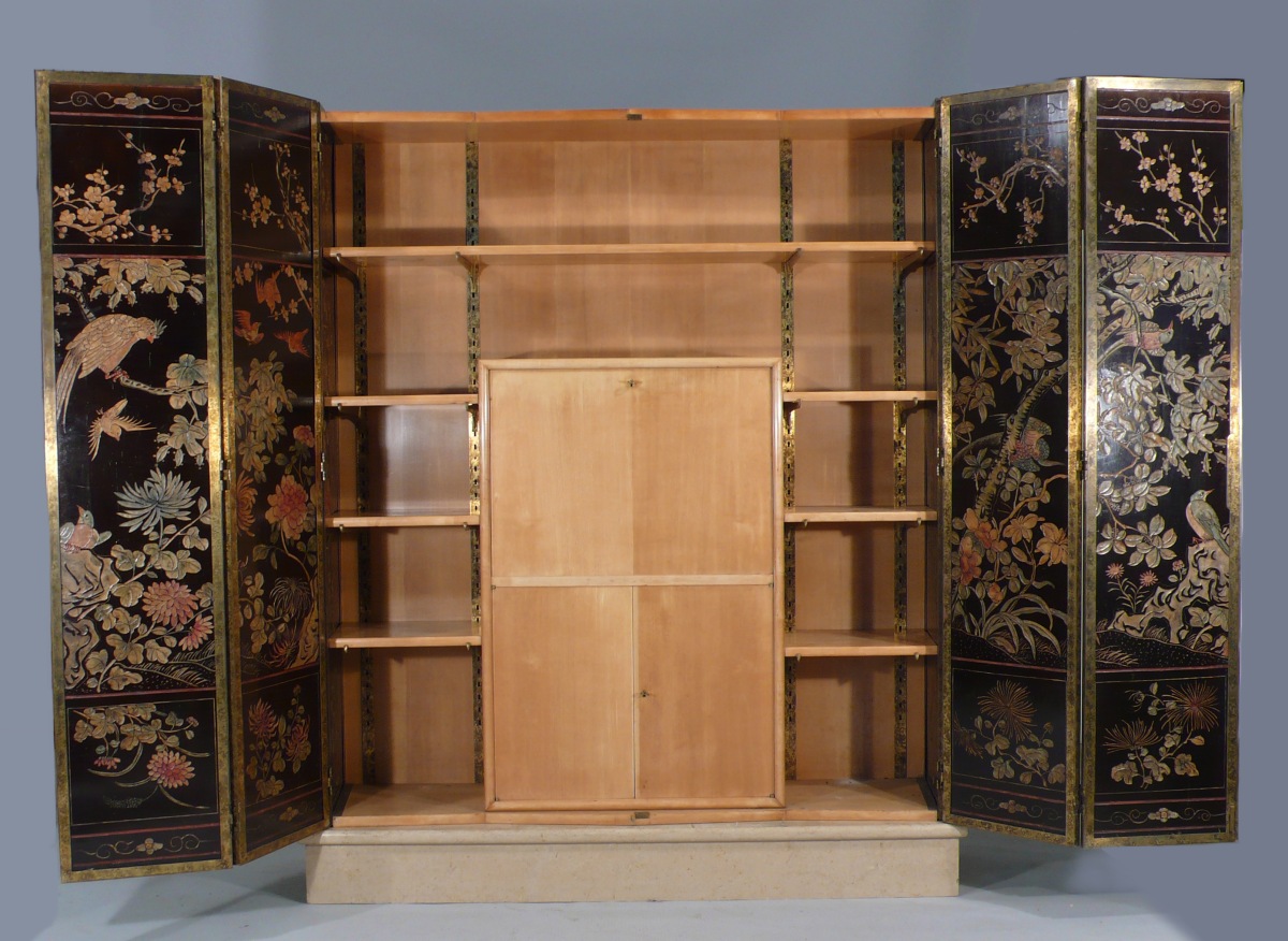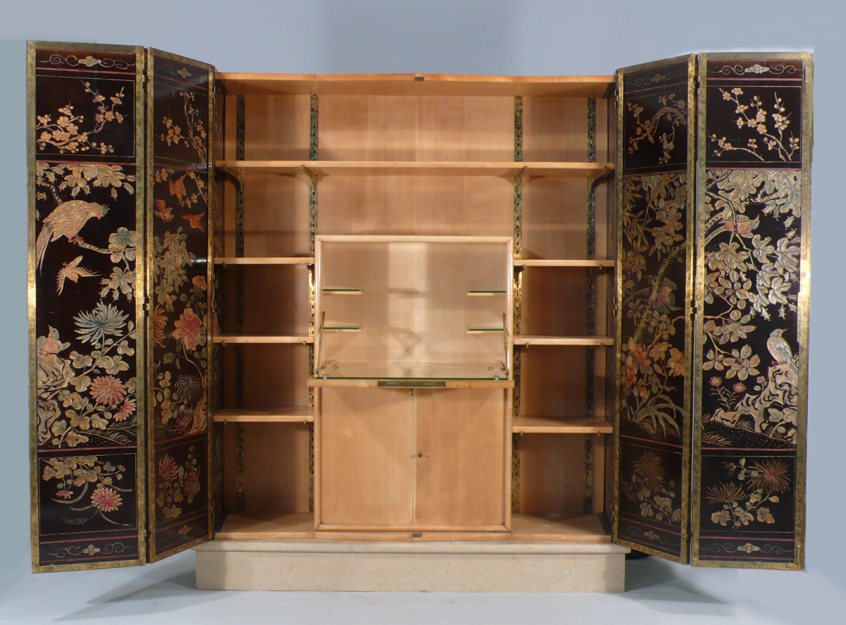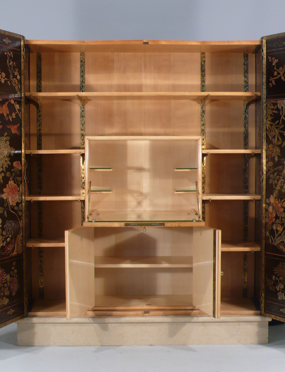 habillé de panneaux de paravent en laque de Coromandel. Il ouvre sur un intérieur en bois de placage blond, composé de deux vantaux, quatre niveaux d'étagères et d'un abattant découvrant quatre tablettes. Les six panneaux-cerclés de laiton patiné - sont à décor polychrome au recto, de scènes guerrières, et, au verso, d'oiseaux dans des branchages fleuris. Repose sur un socle en marbre beige.