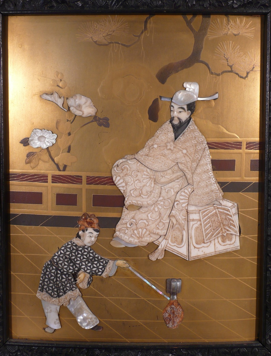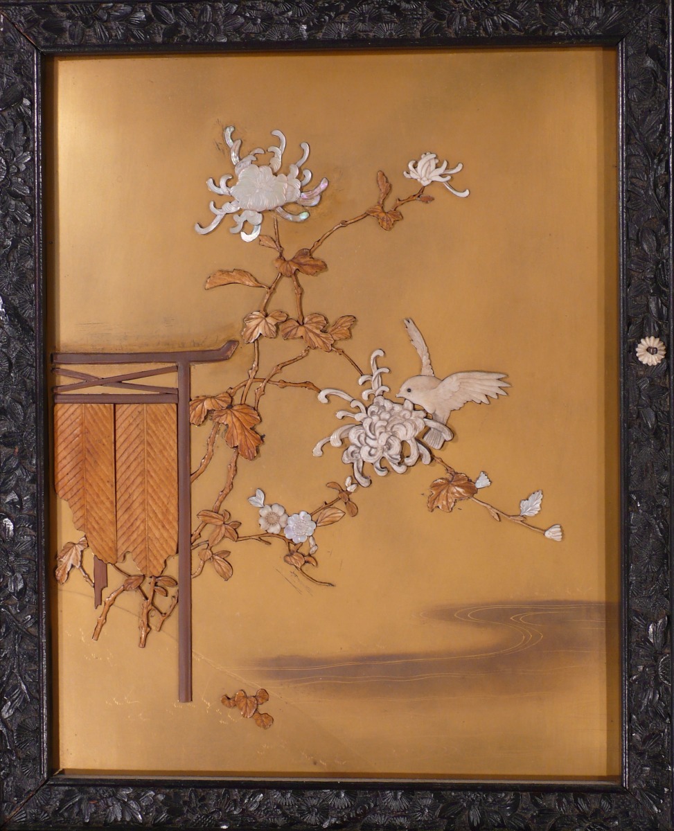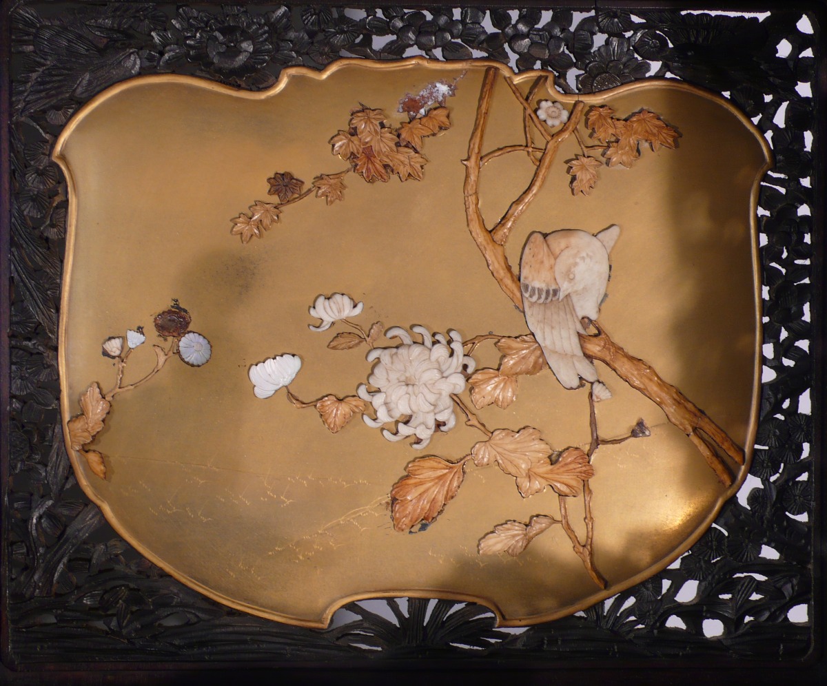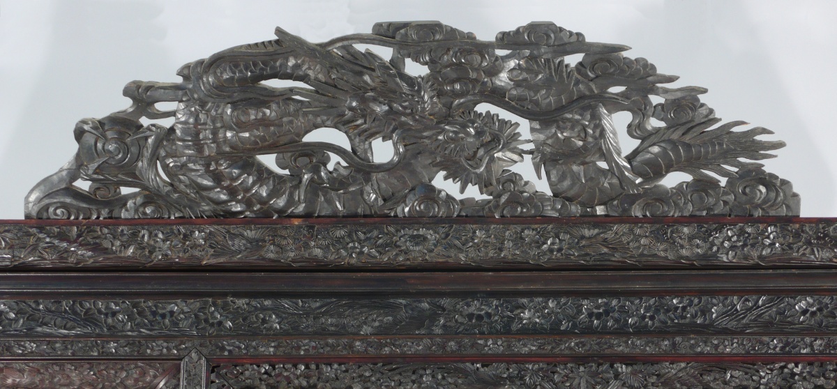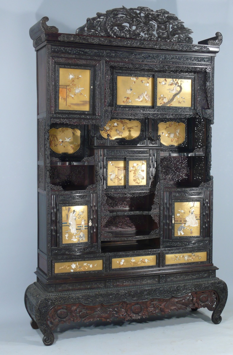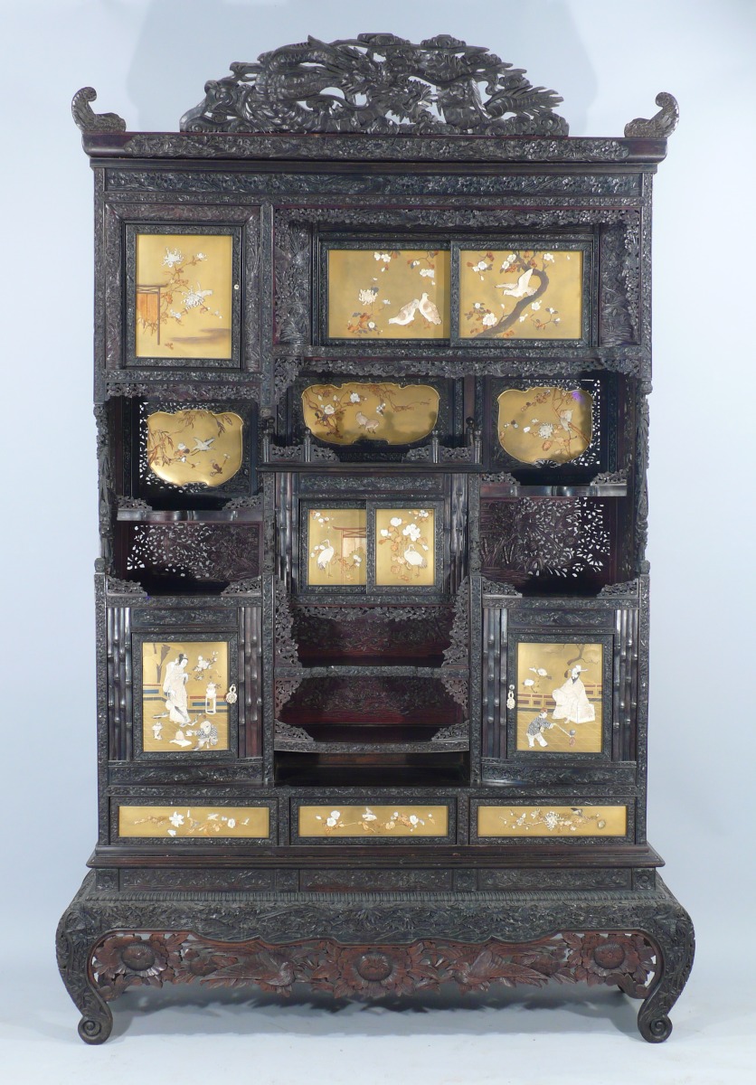 en bois exotique sculpté et ajouré. La façade, à sept casiers apparents, ouvre par sept vantaux dont quatre coulissants et trois tiroirs en partie basse. Décorée de treize plaques de laque dorée, incrustations d'ivoire, os et nacre représentant des oiseaux sur des branchages et des scènes du palais. Le fronton, aux extrémités en gueules de dragons en volutes, à large motif ajouré d'un dragon dans des nuées. Repose sur un piètement à enroulements. Très riche décor sculpté et ajouré de fleurettes et oiseaux dans des branchages.