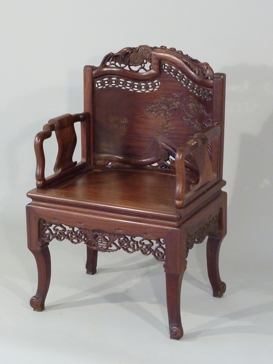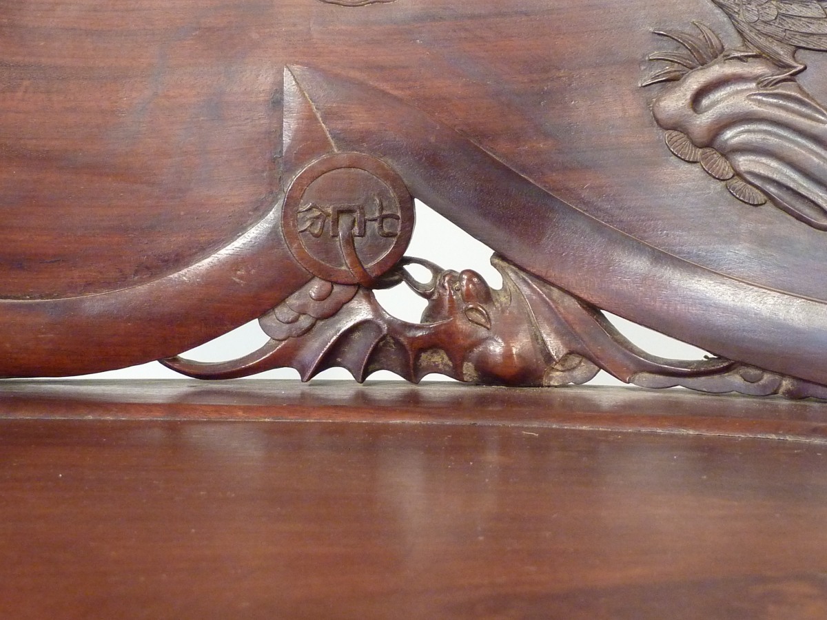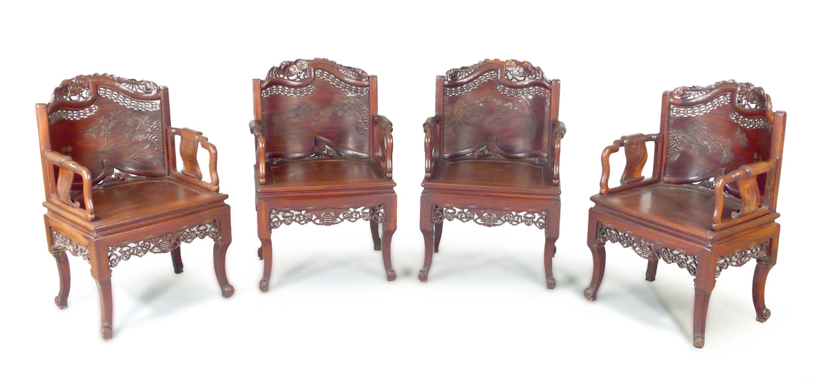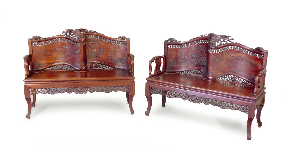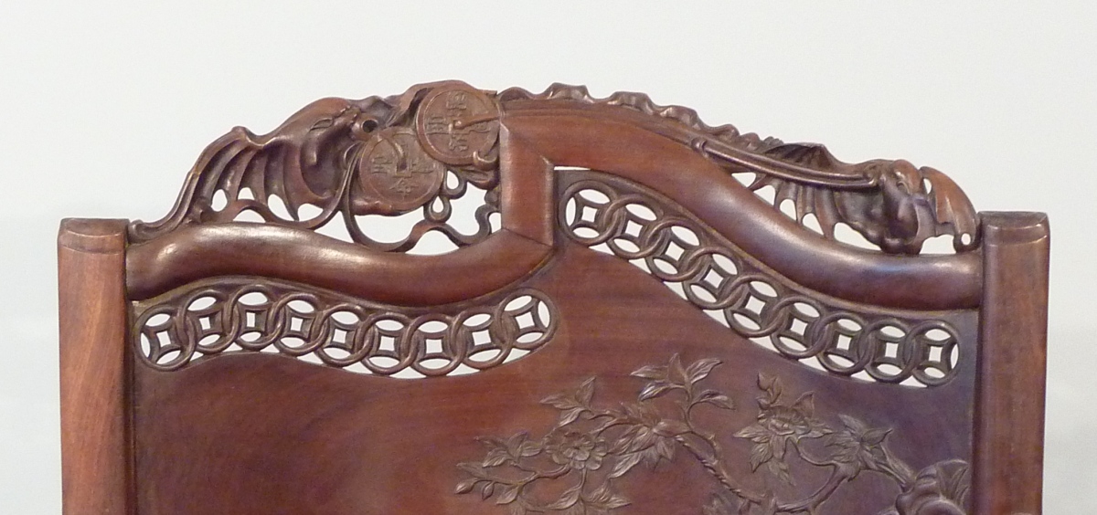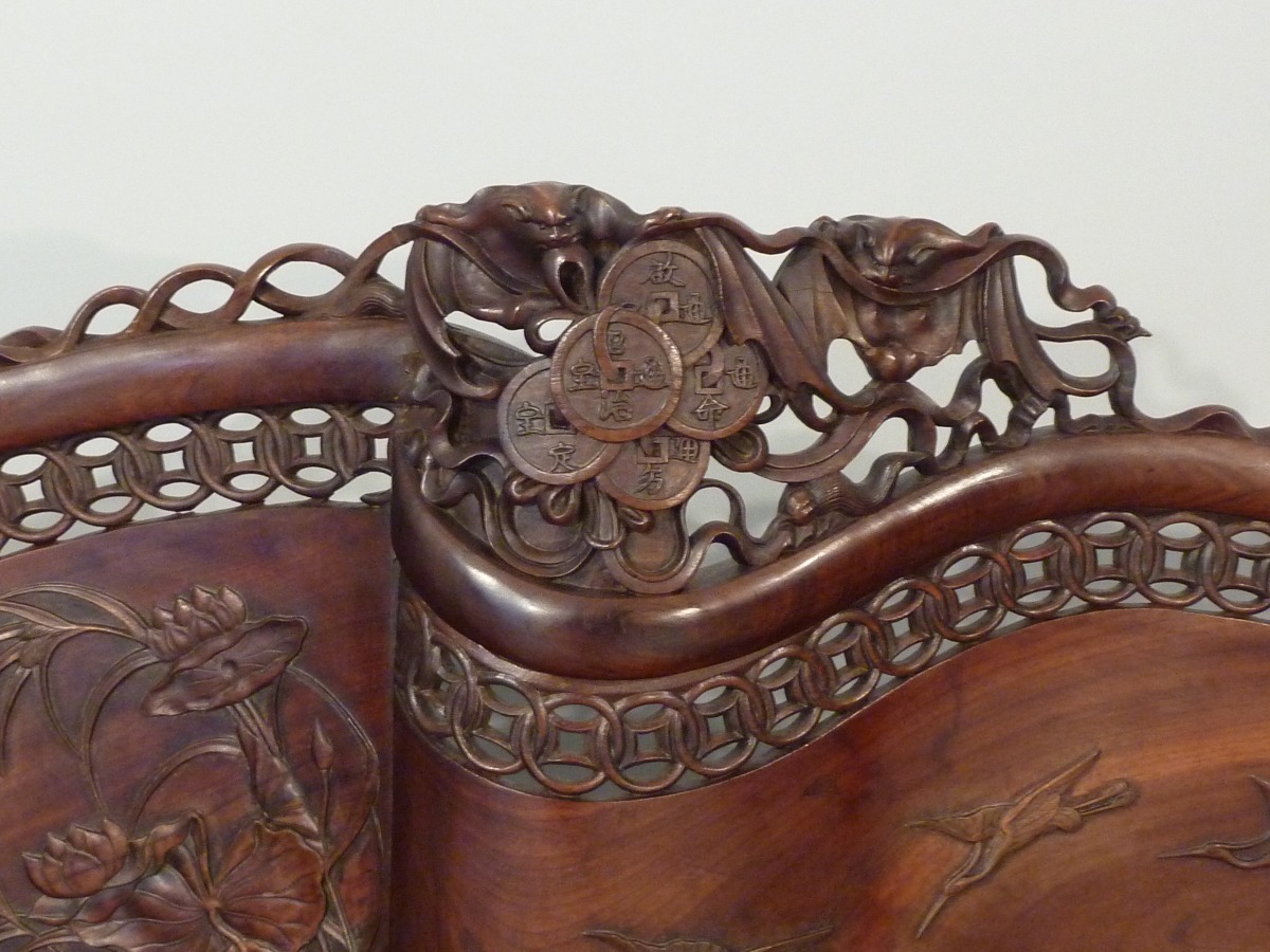 Les dossiers mouvementés, incurvés et ajourés de boucles agrémentés de chauves-souris tenant des piastres. Les chaises à décor d'oiseaux, branchages et gravées d'idéogrammes. Les canapés à décor d'un paysage lacustre aux hérons et fleurs de lotus. Les accotoirs simulent un tissu brodé d'une fleur. La traverse inférieure à décor d'une frise ajourée d'enroulements et centré d'un idéogramme. Repose sur des pieds cambrés de section carrée terminés par des enroulements.