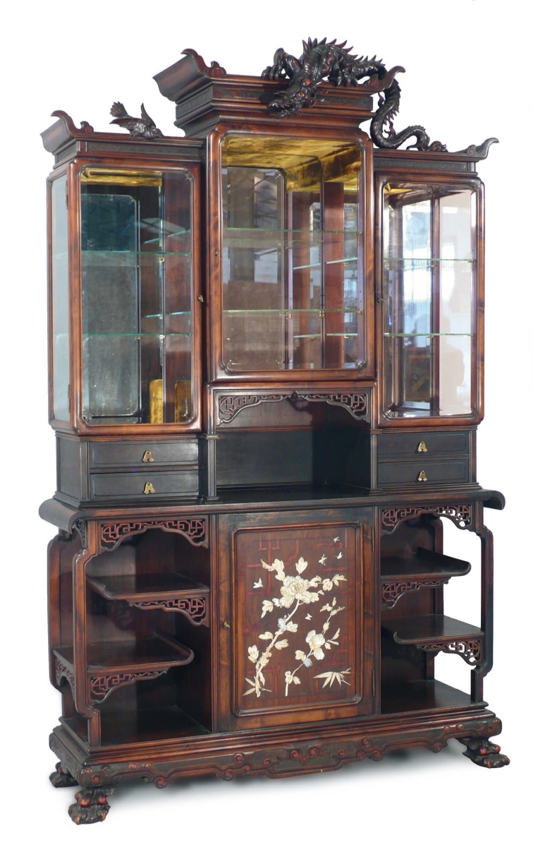 et de velours moutarde, ouvre par trois vantaux vitrés et biseautés surmontant un casier entre quatre tiroirs. Le fronton, en pagode et à décrochement, est sommé d'un dragon menaçant un oiseau. En partie basse, quatre tablettes en console à décor ajouré d'entrelacs et volutes entourent un vantail à incrustations de nacre et d'os figurant une branche de pivoine et des oiseaux. Piétement à décor d'enroulements de nuées reposant sur des griffes enserrant des boules aplaties.