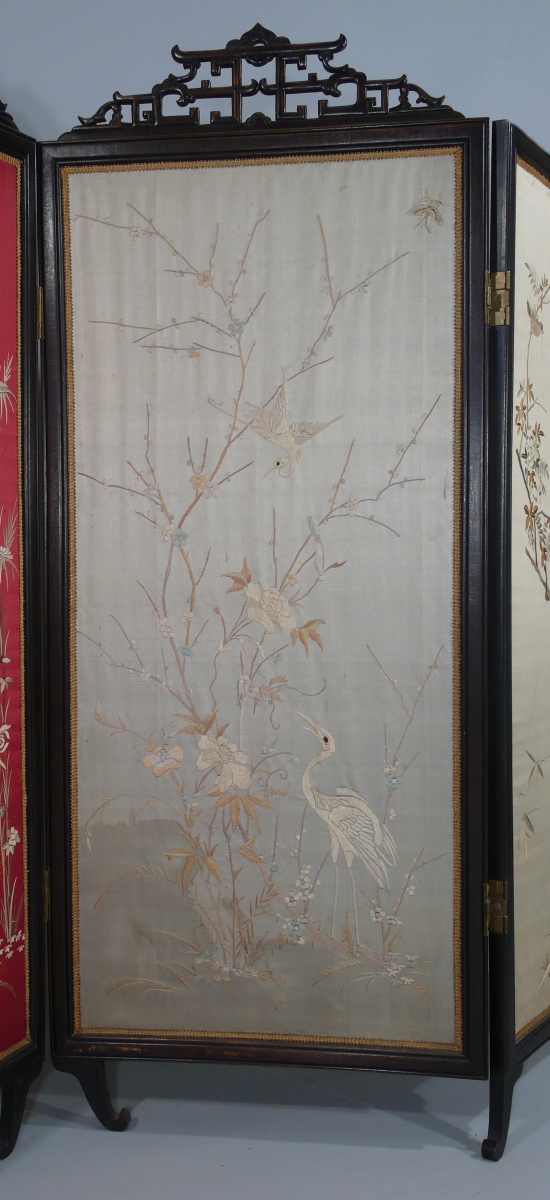à quatre panneaux en soie et bois exotique sculpté. Broderie de soie polychrome sur trois fonds gris et un