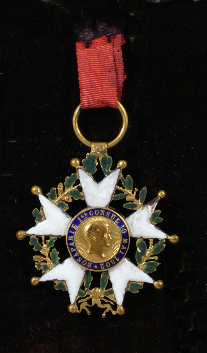 France - Ordre de la Légion d'honneur, étoile d'officier du modèle IIe République, à petite tête, en bronze doré, émail et laque (éclats), fragment de ruban miniature.