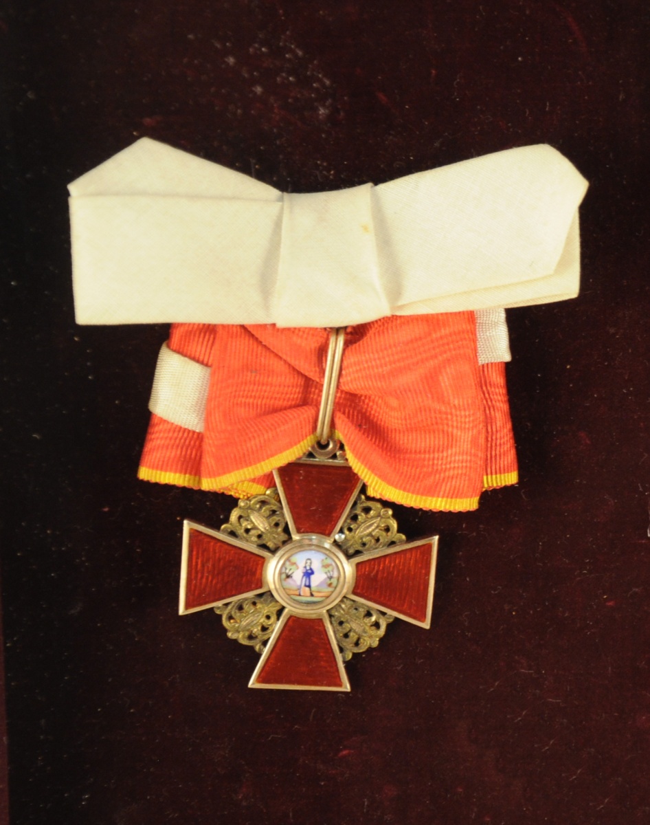 Russie - Ordre impérial de Sainte-Anne, fondé en 1735, croix de 2e classe à titre civil, en or et émail, poinçons de titre 56 sur l'anneau, sous l'émail AK (Albert Keibel), et de fournisseur officiel, cravate complète cousue à un nud papillon blanc.