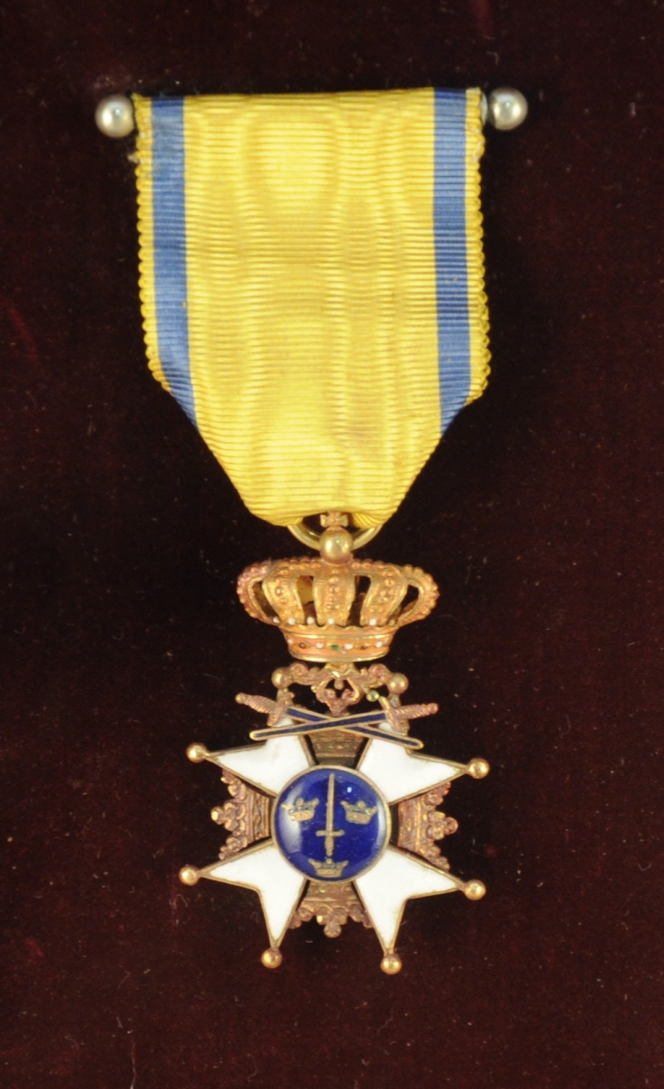 Suède - Ordre de l'Épée, fondé en 1748, croix de chevalier, en or et émail, ruban.