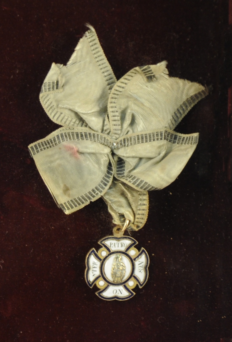 Bavière - Chapitre noble de Sainte-Anne de Munich, institué en 1784, croix de Dame en or et émail (manque l'émail de deux branches latérales au revers), suspendue à un nœud de ruban, avec une écharpe et une très longue coupe de ruban.